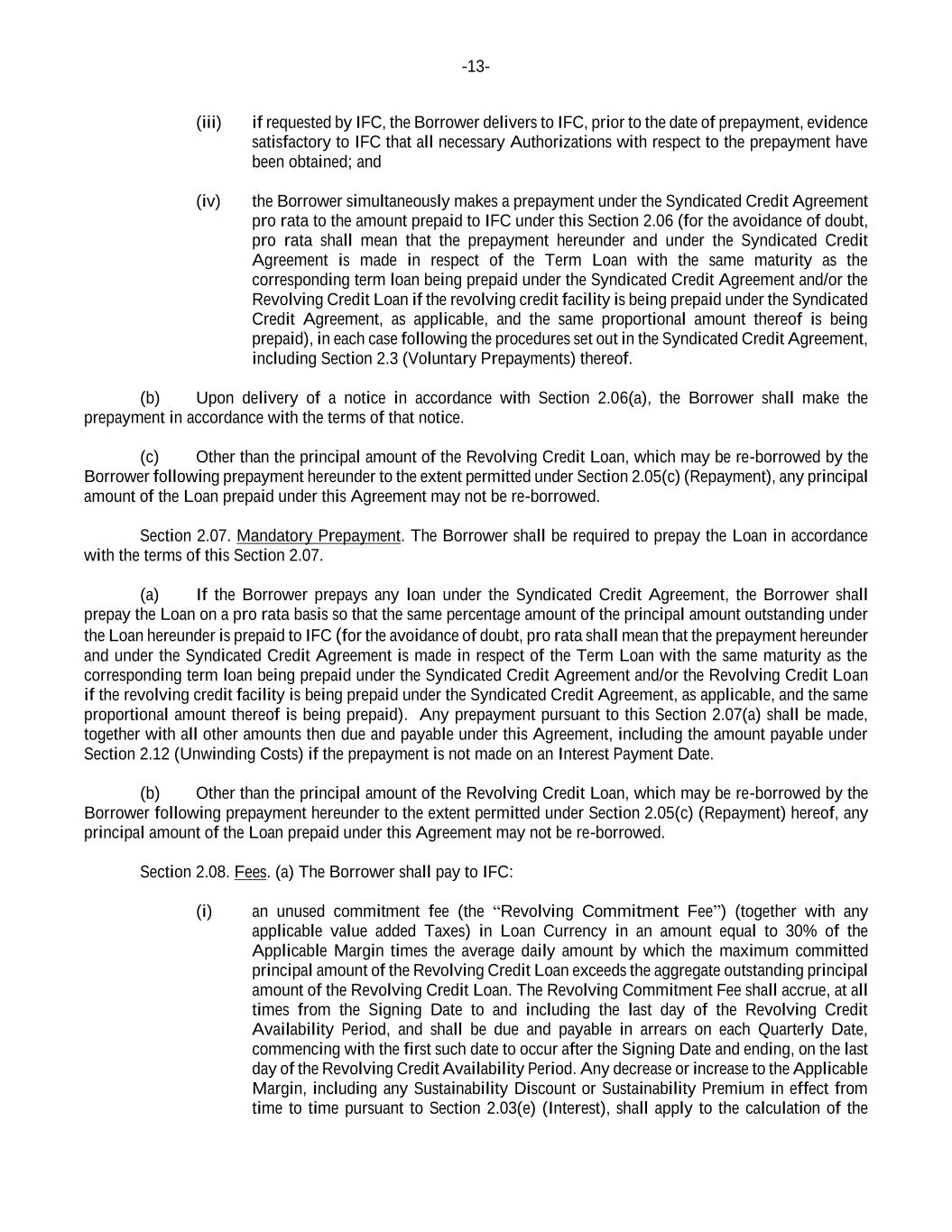 -13- (iii) if requested by IFC, the Borrower delivers to IFC, prior to the date of prepayment, evidence satisfactory to IFC that all necessary Authorizations with respect to the prepayment have been obtained; and (iv) the Borrower simultaneously makes a prepayment under the Syndicated Credit Agreement pro rata to the amount prepaid to IFC under this Section 2.06 (for the avoidance of doubt, pro rata shall mean that the prepayment hereunder and under the Syndicated Credit Agreement is made in respect of the Term Loan with the same maturity as the corresponding term loan being prepaid under the Syndicated Credit Agreement and/or the Revolving Credit Loan if the revolving credit facility is being prepaid under the Syndicated Credit Agreement, as applicable, and the same proportional amount thereof is being prepaid), in each case following the procedures set out in the Syndicated Credit Agreement, including Section 2.3 (Voluntary Prepayments) thereof. (b) Upon delivery of a notice in accordance with Section 2.06(a), the Borrower shall make the prepayment in accordance with the terms of that notice. (c) Other than the principal amount of the Revolving Credit Loan, which may be re-borrowed by the Borrower following prepayment hereunder to the extent permitted under Section 2.05(c) (Repayment), any principal amount of the Loan prepaid under this Agreement may not be re-borrowed. Section 2.07. Mandatory Prepayment. The Borrower shall be required to prepay the Loan in accordance with the terms of this Section 2.07. (a) If the Borrower prepays any loan under the Syndicated Credit Agreement, the Borrower shall prepay the Loan on a pro rata basis so that the same percentage amount of the principal amount outstanding under the Loan hereunder is prepaid to IFC (for the avoidance of doubt, pro rata shall mean that the prepayment hereunder and under the Syndicated Credit Agreement is made in respect of the Term Loan with the same maturity as the corresponding term loan being prepaid under the Syndicated Credit Agreement and/or the Revolving Credit Loan if the revolving credit facility is being prepaid under the Syndicated Credit Agreement, as applicable, and the same proportional amount thereof is being prepaid). Any prepayment pursuant to this Section 2.07(a) shall be made, together with all other amounts then due and payable under this Agreement, including the amount payable under Section 2.12 (Unwinding Costs) if the prepayment is not made on an Interest Payment Date. (b) Other than the principal amount of the Revolving Credit Loan, which may be re-borrowed by the Borrower following prepayment hereunder to the extent permitted under Section 2.05(c) (Repayment) hereof, any principal amount of the Loan prepaid under this Agreement may not be re-borrowed. Section 2.08. Fees. (a) The Borrower shall pay to IFC: (i) an unused commitment fee (the “Revolving Commitment Fee”) (together with any applicable value added Taxes) in Loan Currency in an amount equal to 30% of the Applicable Margin times the average daily amount by which the maximum committed principal amount of the Revolving Credit Loan exceeds the aggregate outstanding principal amount of the Revolving Credit Loan. The Revolving Commitment Fee shall accrue, at all times from the Signing Date to and including the last day of the Revolving Credit Availability Period, and shall be due and payable in arrears on each Quarterly Date, commencing with the first such date to occur after the Signing Date and ending, on the last day of the Revolving Credit Availability Period. Any decrease or increase to the Applicable Margin, including any Sustainability Discount or Sustainability Premium in effect from time to time pursuant to Section 2.03(e) (Interest), shall apply to the calculation of the