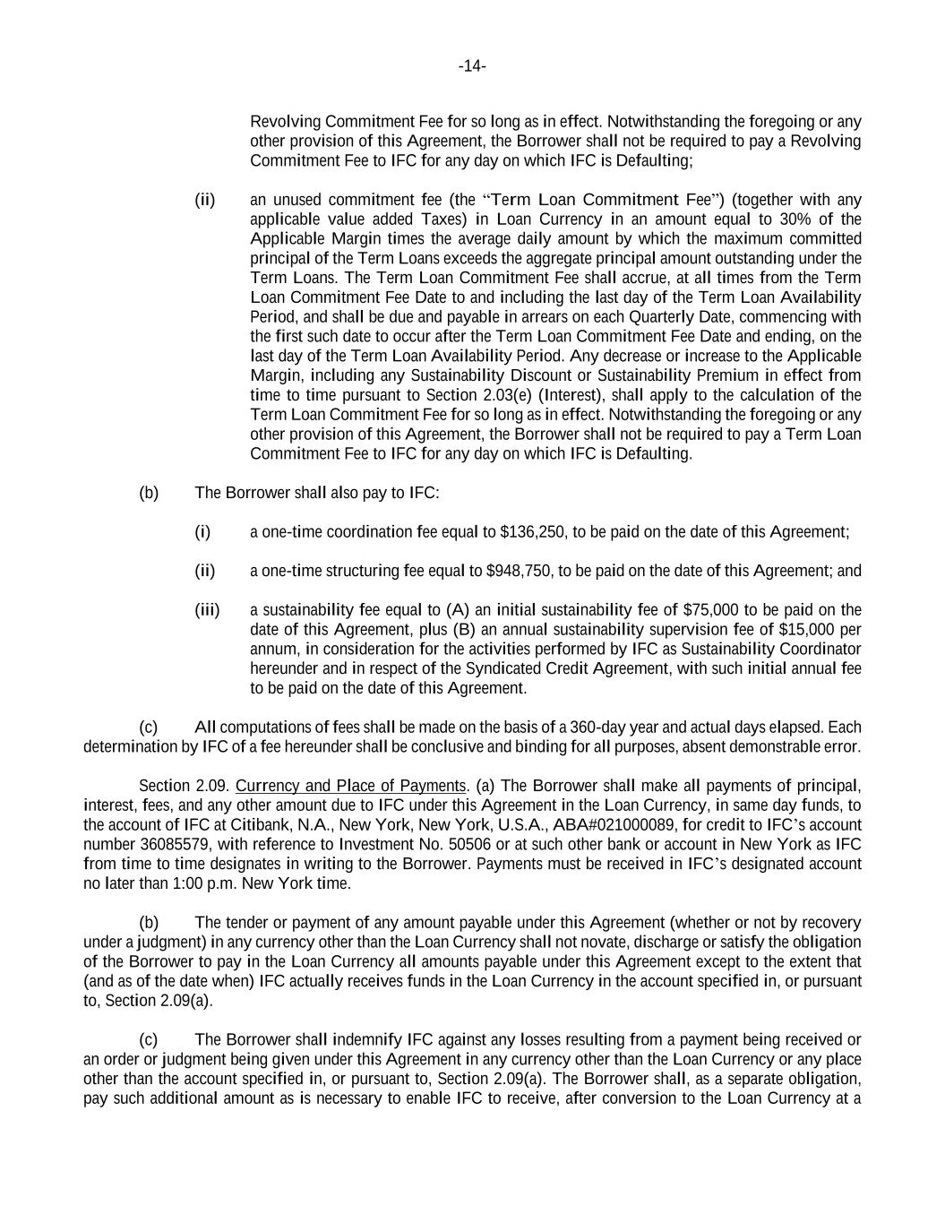 -14- Revolving Commitment Fee for so long as in effect. Notwithstanding the foregoing or any other provision of this Agreement, the Borrower shall not be required to pay a Revolving Commitment Fee to IFC for any day on which IFC is Defaulting; (ii) an unused commitment fee (the “Term Loan Commitment Fee”) (together with any applicable value added Taxes) in Loan Currency in an amount equal to 30% of the Applicable Margin times the average daily amount by which the maximum committed principal of the Term Loans exceeds the aggregate principal amount outstanding under the Term Loans. The Term Loan Commitment Fee shall accrue, at all times from the Term Loan Commitment Fee Date to and including the last day of the Term Loan Availability Period, and shall be due and payable in arrears on each Quarterly Date, commencing with the first such date to occur after the Term Loan Commitment Fee Date and ending, on the last day of the Term Loan Availability Period. Any decrease or increase to the Applicable Margin, including any Sustainability Discount or Sustainability Premium in effect from time to time pursuant to Section 2.03(e) (Interest), shall apply to the calculation of the Term Loan Commitment Fee for so long as in effect. Notwithstanding the foregoing or any other provision of this Agreement, the Borrower shall not be required to pay a Term Loan Commitment Fee to IFC for any day on which IFC is Defaulting. (b) The Borrower shall also pay to IFC: (i) a one-time coordination fee equal to $136,250, to be paid on the date of this Agreement; (ii) a one-time structuring fee equal to $948,750, to be paid on the date of this Agreement; and (iii) a sustainability fee equal to (A) an initial sustainability fee of $75,000 to be paid on the date of this Agreement, plus (B) an annual sustainability supervision fee of $15,000 per annum, in consideration for the activities performed by IFC as Sustainability Coordinator hereunder and in respect of the Syndicated Credit Agreement, with such initial annual fee to be paid on the date of this Agreement. (c) All computations of fees shall be made on the basis of a 360-day year and actual days elapsed. Each determination by IFC of a fee hereunder shall be conclusive and binding for all purposes, absent demonstrable error. Section 2.09. Currency and Place of Payments. (a) The Borrower shall make all payments of principal, interest, fees, and any other amount due to IFC under this Agreement in the Loan Currency, in same day funds, to the account of IFC at Citibank, N.A., New York, New York, U.S.A., ABA#021000089, for credit to IFC’s account number 36085579, with reference to Investment No. 50506 or at such other bank or account in New York as IFC from time to time designates in writing to the Borrower. Payments must be received in IFC’s designated account no later than 1:00 p.m. New York time. (b) The tender or payment of any amount payable under this Agreement (whether or not by recovery under a judgment) in any currency other than the Loan Currency shall not novate, discharge or satisfy the obligation of the Borrower to pay in the Loan Currency all amounts payable under this Agreement except to the extent that (and as of the date when) IFC actually receives funds in the Loan Currency in the account specified in, or pursuant to, Section 2.09(a). (c) The Borrower shall indemnify IFC against any losses resulting from a payment being received or an order or judgment being given under this Agreement in any currency other than the Loan Currency or any place other than the account specified in, or pursuant to, Section 2.09(a). The Borrower shall, as a separate obligation, pay such additional amount as is necessary to enable IFC to receive, after conversion to the Loan Currency at a