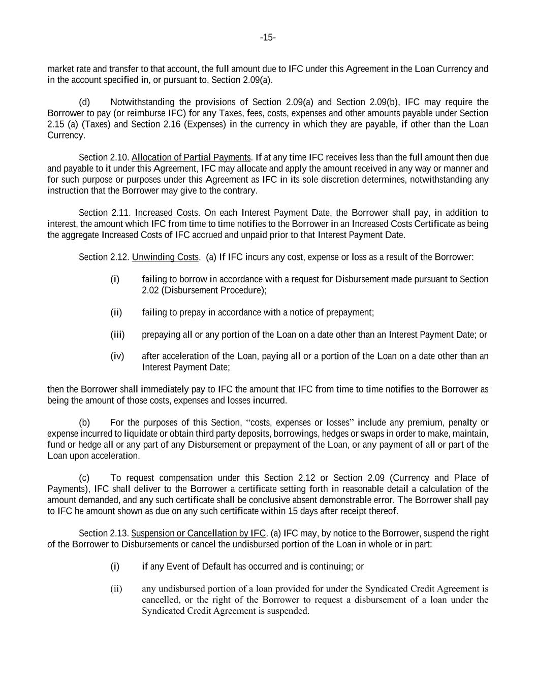 -15- market rate and transfer to that account, the full amount due to IFC under this Agreement in the Loan Currency and in the account specified in, or pursuant to, Section 2.09(a). (d) Notwithstanding the provisions of Section 2.09(a) and Section 2.09(b), IFC may require the Borrower to pay (or reimburse IFC) for any Taxes, fees, costs, expenses and other amounts payable under Section 2.15 (a) (Taxes) and Section 2.16 (Expenses) in the currency in which they are payable, if other than the Loan Currency. Section 2.10. Allocation of Partial Payments. If at any time IFC receives less than the full amount then due and payable to it under this Agreement, IFC may allocate and apply the amount received in any way or manner and for such purpose or purposes under this Agreement as IFC in its sole discretion determines, notwithstanding any instruction that the Borrower may give to the contrary. Section 2.11. Increased Costs. On each Interest Payment Date, the Borrower shall pay, in addition to interest, the amount which IFC from time to time notifies to the Borrower in an Increased Costs Certificate as being the aggregate Increased Costs of IFC accrued and unpaid prior to that Interest Payment Date. Section 2.12. Unwinding Costs. (a) If IFC incurs any cost, expense or loss as a result of the Borrower: (i) failing to borrow in accordance with a request for Disbursement made pursuant to Section 2.02 (Disbursement Procedure); (ii) failing to prepay in accordance with a notice of prepayment; (iii) prepaying all or any portion of the Loan on a date other than an Interest Payment Date; or (iv) after acceleration of the Loan, paying all or a portion of the Loan on a date other than an Interest Payment Date; then the Borrower shall immediately pay to IFC the amount that IFC from time to time notifies to the Borrower as being the amount of those costs, expenses and losses incurred. (b) For the purposes of this Section, “costs, expenses or losses” include any premium, penalty or expense incurred to liquidate or obtain third party deposits, borrowings, hedges or swaps in order to make, maintain, fund or hedge all or any part of any Disbursement or prepayment of the Loan, or any payment of all or part of the Loan upon acceleration. (c) To request compensation under this Section 2.12 or Section 2.09 (Currency and Place of Payments), IFC shall deliver to the Borrower a certificate setting forth in reasonable detail a calculation of the amount demanded, and any such certificate shall be conclusive absent demonstrable error. The Borrower shall pay to IFC he amount shown as due on any such certificate within 15 days after receipt thereof. Section 2.13. Suspension or Cancellation by IFC. (a) IFC may, by notice to the Borrower, suspend the right of the Borrower to Disbursements or cancel the undisbursed portion of the Loan in whole or in part: (i) if any Event of Default has occurred and is continuing; or (ii) any undisbursed portion of a loan provided for under the Syndicated Credit Agreement is cancelled, or the right of the Borrower to request a disbursement of a loan under the Syndicated Credit Agreement is suspended.
