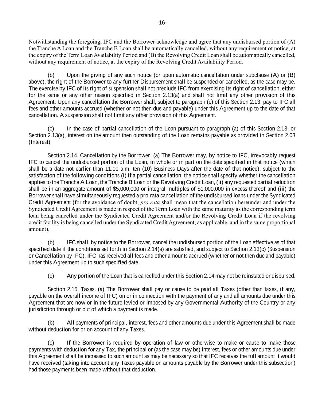 -16- Notwithstanding the foregoing, IFC and the Borrower acknowledge and agree that any undisbursed portion of (A) the Tranche A Loan and the Tranche B Loan shall be automatically cancelled, without any requirement of notice, at the expiry of the Term Loan Availability Period and (B) the Revolving Credit Loan shall be automatically cancelled, without any requirement of notice, at the expiry of the Revolving Credit Availability Period. (b) Upon the giving of any such notice (or upon automatic cancellation under subclause (A) or (B) above), the right of the Borrower to any further Disbursement shall be suspended or cancelled, as the case may be. The exercise by IFC of its right of suspension shall not preclude IFC from exercising its right of cancellation, either for the same or any other reason specified in Section 2.13(a) and shall not limit any other provision of this Agreement. Upon any cancellation the Borrower shall, subject to paragraph (c) of this Section 2.13, pay to IFC all fees and other amounts accrued (whether or not then due and payable) under this Agreement up to the date of that cancellation. A suspension shall not limit any other provision of this Agreement. (c) In the case of partial cancellation of the Loan pursuant to paragraph (a) of this Section 2.13, or Section 2.13(a), interest on the amount then outstanding of the Loan remains payable as provided in Section 2.03 (Interest). Section 2.14. Cancellation by the Borrower. (a) The Borrower may, by notice to IFC, irrevocably request IFC to cancel the undisbursed portion of the Loan, in whole or in part on the date specified in that notice (which shall be a date not earlier than 11:00 a.m. ten (10) Business Days after the date of that notice), subject to the satisfaction of the following conditions (i) if a partial cancellation, the notice shall specify whether the cancellation applies to the Tranche A Loan, the Tranche B Loan or the Revolving Credit Loan, (ii) any requested partial reduction shall be in an aggregate amount of $5,000,000 or integral multiples of $1,000,000 in excess thereof and (iii) the Borrower shall have simultaneously requested a pro rata cancellation of the undisbursed loans under the Syndicated Credit Agreement (for the avoidance of doubt, pro rata shall mean that the cancellation hereunder and under the Syndicated Credit Agreement is made in respect of the Term Loan with the same maturity as the corresponding term loan being cancelled under the Syndicated Credit Agreement and/or the Revolving Credit Loan if the revolving credit facility is being cancelled under the Syndicated Credit Agreement, as applicable, and in the same proportional amount). (b) IFC shall, by notice to the Borrower, cancel the undisbursed portion of the Loan effective as of that specified date if the conditions set forth in Section 2.14(a) are satisfied, and subject to Section 2.13(c) (Suspension or Cancellation by IFC), IFC has received all fees and other amounts accrued (whether or not then due and payable) under this Agreement up to such specified date. (c) Any portion of the Loan that is cancelled under this Section 2.14 may not be reinstated or disbursed. Section 2.15. Taxes. (a) The Borrower shall pay or cause to be paid all Taxes (other than taxes, if any, payable on the overall income of IFC) on or in connection with the payment of any and all amounts due under this Agreement that are now or in the future levied or imposed by any Governmental Authority of the Country or any jurisdiction through or out of which a payment is made. (b) All payments of principal, interest, fees and other amounts due under this Agreement shall be made without deduction for or on account of any Taxes. (c) If the Borrower is required by operation of law or otherwise to make or cause to make those payments with deduction for any Tax, the principal or (as the case may be) interest, fees or other amounts due under this Agreement shall be increased to such amount as may be necessary so that IFC receives the full amount it would have received (taking into account any Taxes payable on amounts payable by the Borrower under this subsection) had those payments been made without that deduction.