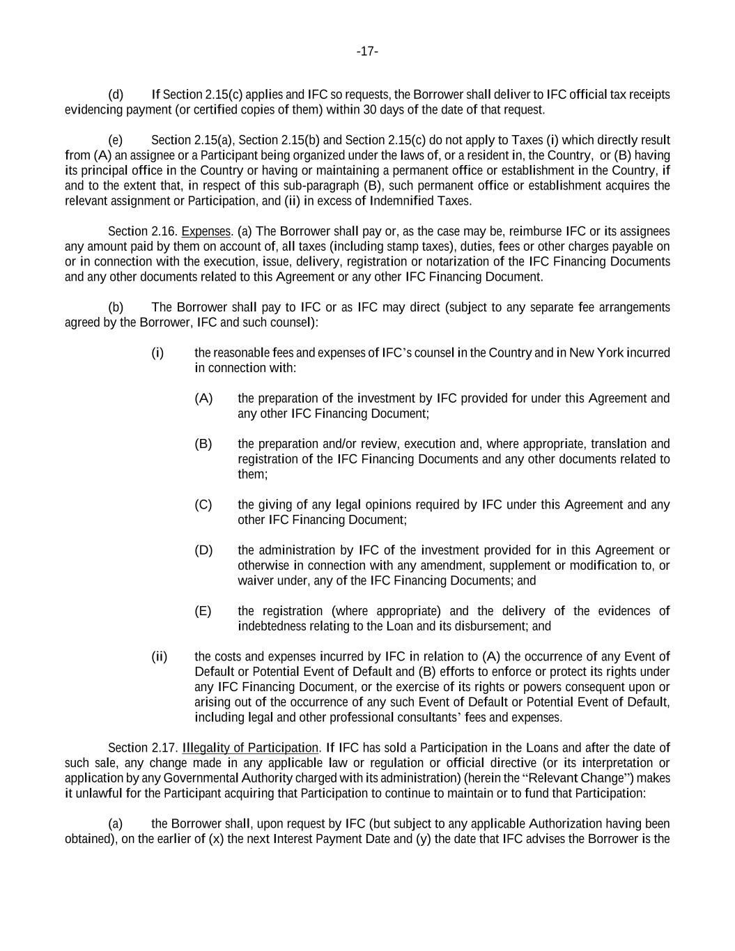 -17- (d) If Section 2.15(c) applies and IFC so requests, the Borrower shall deliver to IFC official tax receipts evidencing payment (or certified copies of them) within 30 days of the date of that request. (e) Section 2.15(a), Section 2.15(b) and Section 2.15(c) do not apply to Taxes (i) which directly result from (A) an assignee or a Participant being organized under the laws of, or a resident in, the Country, or (B) having its principal office in the Country or having or maintaining a permanent office or establishment in the Country, if and to the extent that, in respect of this sub-paragraph (B), such permanent office or establishment acquires the relevant assignment or Participation, and (ii) in excess of Indemnified Taxes. Section 2.16. Expenses. (a) The Borrower shall pay or, as the case may be, reimburse IFC or its assignees any amount paid by them on account of, all taxes (including stamp taxes), duties, fees or other charges payable on or in connection with the execution, issue, delivery, registration or notarization of the IFC Financing Documents and any other documents related to this Agreement or any other IFC Financing Document. (b) The Borrower shall pay to IFC or as IFC may direct (subject to any separate fee arrangements agreed by the Borrower, IFC and such counsel): (i) the reasonable fees and expenses of IFC’s counsel in the Country and in New York incurred in connection with: (A) the preparation of the investment by IFC provided for under this Agreement and any other IFC Financing Document; (B) the preparation and/or review, execution and, where appropriate, translation and registration of the IFC Financing Documents and any other documents related to them; (C) the giving of any legal opinions required by IFC under this Agreement and any other IFC Financing Document; (D) the administration by IFC of the investment provided for in this Agreement or otherwise in connection with any amendment, supplement or modification to, or waiver under, any of the IFC Financing Documents; and (E) the registration (where appropriate) and the delivery of the evidences of indebtedness relating to the Loan and its disbursement; and (ii) the costs and expenses incurred by IFC in relation to (A) the occurrence of any Event of Default or Potential Event of Default and (B) efforts to enforce or protect its rights under any IFC Financing Document, or the exercise of its rights or powers consequent upon or arising out of the occurrence of any such Event of Default or Potential Event of Default, including legal and other professional consultants’ fees and expenses. Section 2.17. Illegality of Participation. If IFC has sold a Participation in the Loans and after the date of such sale, any change made in any applicable law or regulation or official directive (or its interpretation or application by any Governmental Authority charged with its administration) (herein the “Relevant Change”) makes it unlawful for the Participant acquiring that Participation to continue to maintain or to fund that Participation: (a) the Borrower shall, upon request by IFC (but subject to any applicable Authorization having been obtained), on the earlier of (x) the next Interest Payment Date and (y) the date that IFC advises the Borrower is the