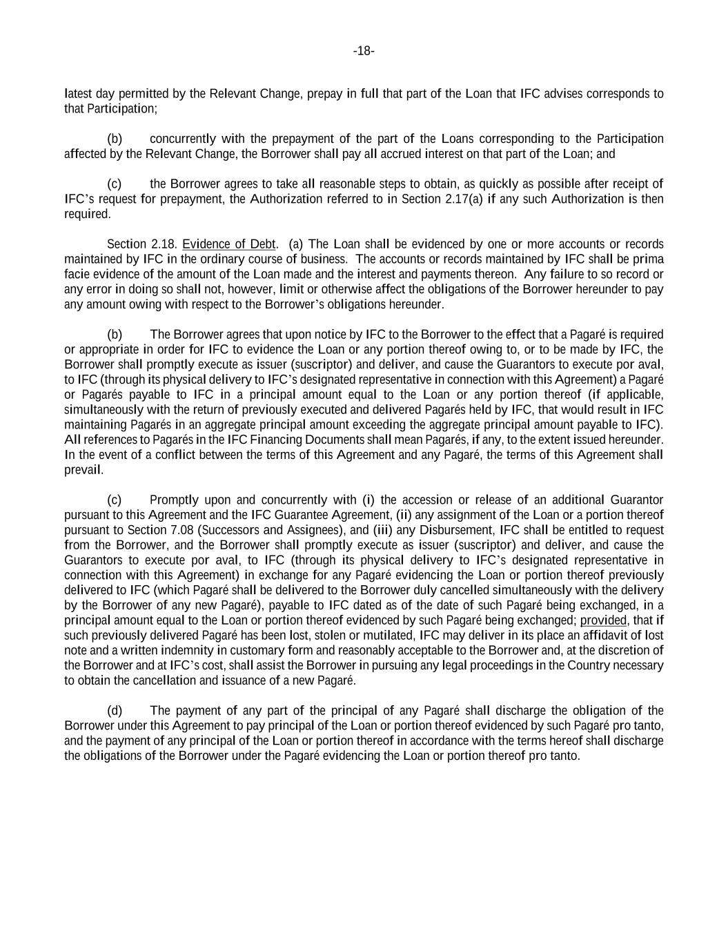 -18- latest day permitted by the Relevant Change, prepay in full that part of the Loan that IFC advises corresponds to that Participation; (b) concurrently with the prepayment of the part of the Loans corresponding to the Participation affected by the Relevant Change, the Borrower shall pay all accrued interest on that part of the Loan; and (c) the Borrower agrees to take all reasonable steps to obtain, as quickly as possible after receipt of IFC’s request for prepayment, the Authorization referred to in Section 2.17(a) if any such Authorization is then required. Section 2.18. Evidence of Debt. (a) The Loan shall be evidenced by one or more accounts or records maintained by IFC in the ordinary course of business. The accounts or records maintained by IFC shall be prima facie evidence of the amount of the Loan made and the interest and payments thereon. Any failure to so record or any error in doing so shall not, however, limit or otherwise affect the obligations of the Borrower hereunder to pay any amount owing with respect to the Borrower’s obligations hereunder. (b) The Borrower agrees that upon notice by IFC to the Borrower to the effect that a Pagaré is required or appropriate in order for IFC to evidence the Loan or any portion thereof owing to, or to be made by IFC, the Borrower shall promptly execute as issuer (suscriptor) and deliver, and cause the Guarantors to execute por aval, to IFC (through its physical delivery to IFC’s designated representative in connection with this Agreement) a Pagaré or Pagarés payable to IFC in a principal amount equal to the Loan or any portion thereof (if applicable, simultaneously with the return of previously executed and delivered Pagarés held by IFC, that would result in IFC maintaining Pagarés in an aggregate principal amount exceeding the aggregate principal amount payable to IFC). All references to Pagarés in the IFC Financing Documents shall mean Pagarés, if any, to the extent issued hereunder. In the event of a conflict between the terms of this Agreement and any Pagaré, the terms of this Agreement shall prevail. (c) Promptly upon and concurrently with (i) the accession or release of an additional Guarantor pursuant to this Agreement and the IFC Guarantee Agreement, (ii) any assignment of the Loan or a portion thereof pursuant to Section 7.08 (Successors and Assignees), and (iii) any Disbursement, IFC shall be entitled to request from the Borrower, and the Borrower shall promptly execute as issuer (suscriptor) and deliver, and cause the Guarantors to execute por aval, to IFC (through its physical delivery to IFC’s designated representative in connection with this Agreement) in exchange for any Pagaré evidencing the Loan or portion thereof previously delivered to IFC (which Pagaré shall be delivered to the Borrower duly cancelled simultaneously with the delivery by the Borrower of any new Pagaré), payable to IFC dated as of the date of such Pagaré being exchanged, in a principal amount equal to the Loan or portion thereof evidenced by such Pagaré being exchanged; provided, that if such previously delivered Pagaré has been lost, stolen or mutilated, IFC may deliver in its place an affidavit of lost note and a written indemnity in customary form and reasonably acceptable to the Borrower and, at the discretion of the Borrower and at IFC’s cost, shall assist the Borrower in pursuing any legal proceedings in the Country necessary to obtain the cancellation and issuance of a new Pagaré. (d) The payment of any part of the principal of any Pagaré shall discharge the obligation of the Borrower under this Agreement to pay principal of the Loan or portion thereof evidenced by such Pagaré pro tanto, and the payment of any principal of the Loan or portion thereof in accordance with the terms hereof shall discharge the obligations of the Borrower under the Pagaré evidencing the Loan or portion thereof pro tanto.
