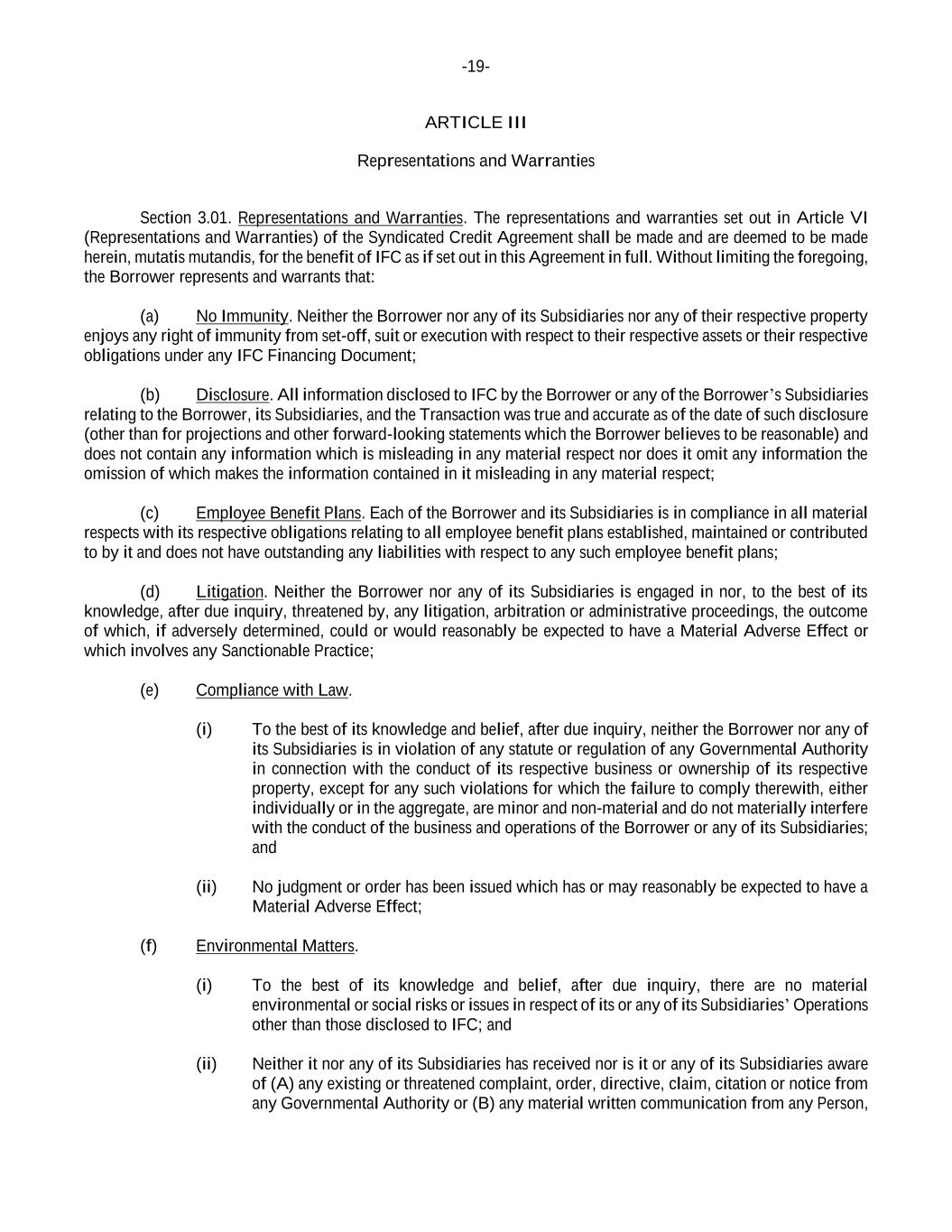 -19- ARTICLE III Representations and Warranties Section 3.01. Representations and Warranties. The representations and warranties set out in Article VI (Representations and Warranties) of the Syndicated Credit Agreement shall be made and are deemed to be made herein, mutatis mutandis, for the benefit of IFC as if set out in this Agreement in full. Without limiting the foregoing, the Borrower represents and warrants that: (a) No Immunity. Neither the Borrower nor any of its Subsidiaries nor any of their respective property enjoys any right of immunity from set-off, suit or execution with respect to their respective assets or their respective obligations under any IFC Financing Document; (b) Disclosure. All information disclosed to IFC by the Borrower or any of the Borrower’s Subsidiaries relating to the Borrower, its Subsidiaries, and the Transaction was true and accurate as of the date of such disclosure (other than for projections and other forward-looking statements which the Borrower believes to be reasonable) and does not contain any information which is misleading in any material respect nor does it omit any information the omission of which makes the information contained in it misleading in any material respect; (c) Employee Benefit Plans. Each of the Borrower and its Subsidiaries is in compliance in all material respects with its respective obligations relating to all employee benefit plans established, maintained or contributed to by it and does not have outstanding any liabilities with respect to any such employee benefit plans; (d) Litigation. Neither the Borrower nor any of its Subsidiaries is engaged in nor, to the best of its knowledge, after due inquiry, threatened by, any litigation, arbitration or administrative proceedings, the outcome of which, if adversely determined, could or would reasonably be expected to have a Material Adverse Effect or which involves any Sanctionable Practice; (e) Compliance with Law. (i) To the best of its knowledge and belief, after due inquiry, neither the Borrower nor any of its Subsidiaries is in violation of any statute or regulation of any Governmental Authority in connection with the conduct of its respective business or ownership of its respective property, except for any such violations for which the failure to comply therewith, either individually or in the aggregate, are minor and non-material and do not materially interfere with the conduct of the business and operations of the Borrower or any of its Subsidiaries; and (ii) No judgment or order has been issued which has or may reasonably be expected to have a Material Adverse Effect; (f) Environmental Matters. (i) To the best of its knowledge and belief, after due inquiry, there are no material environmental or social risks or issues in respect of its or any of its Subsidiaries’ Operations other than those disclosed to IFC; and (ii) Neither it nor any of its Subsidiaries has received nor is it or any of its Subsidiaries aware of (A) any existing or threatened complaint, order, directive, claim, citation or notice from any Governmental Authority or (B) any material written communication from any Person,