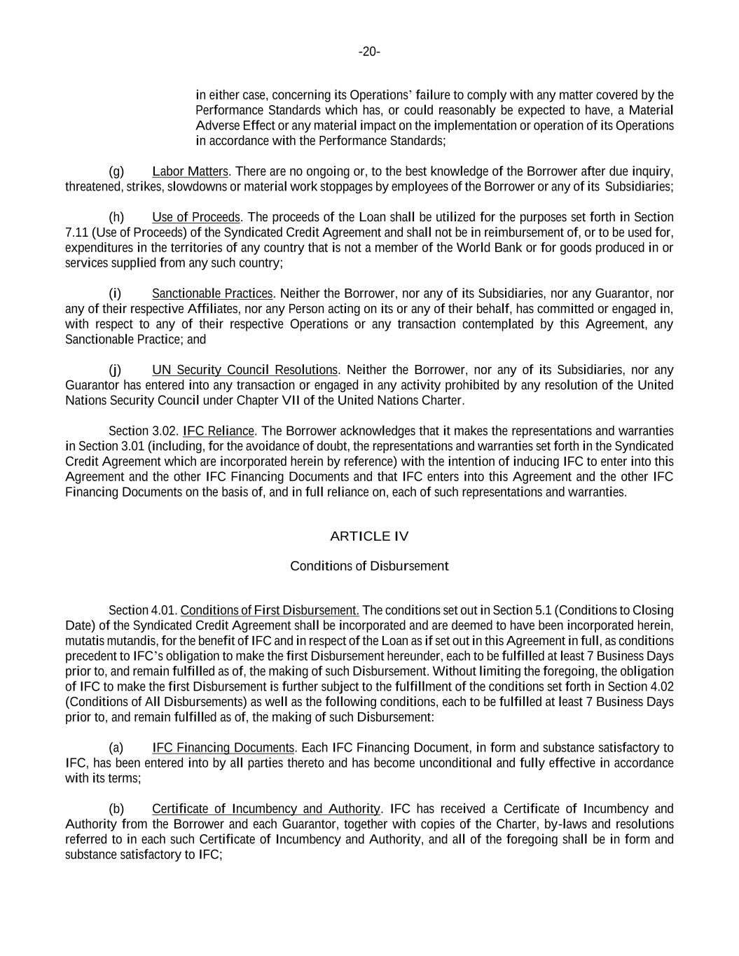-20- in either case, concerning its Operations’ failure to comply with any matter covered by the Performance Standards which has, or could reasonably be expected to have, a Material Adverse Effect or any material impact on the implementation or operation of its Operations in accordance with the Performance Standards; (g) Labor Matters. There are no ongoing or, to the best knowledge of the Borrower after due inquiry, threatened, strikes, slowdowns or material work stoppages by employees of the Borrower or any of its Subsidiaries; (h) Use of Proceeds. The proceeds of the Loan shall be utilized for the purposes set forth in Section 7.11 (Use of Proceeds) of the Syndicated Credit Agreement and shall not be in reimbursement of, or to be used for, expenditures in the territories of any country that is not a member of the World Bank or for goods produced in or services supplied from any such country; (i) Sanctionable Practices. Neither the Borrower, nor any of its Subsidiaries, nor any Guarantor, nor any of their respective Affiliates, nor any Person acting on its or any of their behalf, has committed or engaged in, with respect to any of their respective Operations or any transaction contemplated by this Agreement, any Sanctionable Practice; and (j) UN Security Council Resolutions. Neither the Borrower, nor any of its Subsidiaries, nor any Guarantor has entered into any transaction or engaged in any activity prohibited by any resolution of the United Nations Security Council under Chapter VII of the United Nations Charter. Section 3.02. IFC Reliance. The Borrower acknowledges that it makes the representations and warranties in Section 3.01 (including, for the avoidance of doubt, the representations and warranties set forth in the Syndicated Credit Agreement which are incorporated herein by reference) with the intention of inducing IFC to enter into this Agreement and the other IFC Financing Documents and that IFC enters into this Agreement and the other IFC Financing Documents on the basis of, and in full reliance on, each of such representations and warranties. ARTICLE IV Conditions of Disbursement Section 4.01. Conditions of First Disbursement. The conditions set out in Section 5.1 (Conditions to Closing Date) of the Syndicated Credit Agreement shall be incorporated and are deemed to have been incorporated herein, mutatis mutandis, for the benefit of IFC and in respect of the Loan as if set out in this Agreement in full, as conditions precedent to IFC’s obligation to make the first Disbursement hereunder, each to be fulfilled at least 7 Business Days prior to, and remain fulfilled as of, the making of such Disbursement. Without limiting the foregoing, the obligation of IFC to make the first Disbursement is further subject to the fulfillment of the conditions set forth in Section 4.02 (Conditions of All Disbursements) as well as the following conditions, each to be fulfilled at least 7 Business Days prior to, and remain fulfilled as of, the making of such Disbursement: (a) IFC Financing Documents. Each IFC Financing Document, in form and substance satisfactory to IFC, has been entered into by all parties thereto and has become unconditional and fully effective in accordance with its terms; (b) Certificate of Incumbency and Authority. IFC has received a Certificate of Incumbency and Authority from the Borrower and each Guarantor, together with copies of the Charter, by-laws and resolutions referred to in each such Certificate of Incumbency and Authority, and all of the foregoing shall be in form and substance satisfactory to IFC;