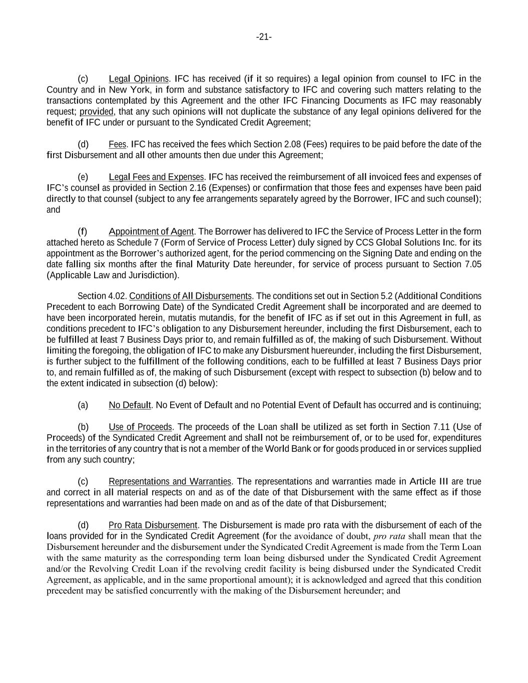 -21- (c) Legal Opinions. IFC has received (if it so requires) a legal opinion from counsel to IFC in the Country and in New York, in form and substance satisfactory to IFC and covering such matters relating to the transactions contemplated by this Agreement and the other IFC Financing Documents as IFC may reasonably request; provided, that any such opinions will not duplicate the substance of any legal opinions delivered for the benefit of IFC under or pursuant to the Syndicated Credit Agreement; (d) Fees. IFC has received the fees which Section 2.08 (Fees) requires to be paid before the date of the first Disbursement and all other amounts then due under this Agreement; (e) Legal Fees and Expenses. IFC has received the reimbursement of all invoiced fees and expenses of IFC’s counsel as provided in Section 2.16 (Expenses) or confirmation that those fees and expenses have been paid directly to that counsel (subject to any fee arrangements separately agreed by the Borrower, IFC and such counsel); and (f) Appointment of Agent. The Borrower has delivered to IFC the Service of Process Letter in the form attached hereto as Schedule 7 (Form of Service of Process Letter) duly signed by CCS Global Solutions Inc. for its appointment as the Borrower’s authorized agent, for the period commencing on the Signing Date and ending on the date falling six months after the final Maturity Date hereunder, for service of process pursuant to Section 7.05 (Applicable Law and Jurisdiction). Section 4.02. Conditions of All Disbursements. The conditions set out in Section 5.2 (Additional Conditions Precedent to each Borrowing Date) of the Syndicated Credit Agreement shall be incorporated and are deemed to have been incorporated herein, mutatis mutandis, for the benefit of IFC as if set out in this Agreement in full, as conditions precedent to IFC’s obligation to any Disbursement hereunder, including the first Disbursement, each to be fulfilled at least 7 Business Days prior to, and remain fulfilled as of, the making of such Disbursement. Without limiting the foregoing, the obligation of IFC to make any Disbursment huereunder, including the first Disbursement, is further subject to the fulfillment of the following conditions, each to be fulfilled at least 7 Business Days prior to, and remain fulfilled as of, the making of such Disbursement (except with respect to subsection (b) below and to the extent indicated in subsection (d) below): (a) No Default. No Event of Default and no Potential Event of Default has occurred and is continuing; (b) Use of Proceeds. The proceeds of the Loan shall be utilized as set forth in Section 7.11 (Use of Proceeds) of the Syndicated Credit Agreement and shall not be reimbursement of, or to be used for, expenditures in the territories of any country that is not a member of the World Bank or for goods produced in or services supplied from any such country; (c) Representations and Warranties. The representations and warranties made in Article III are true and correct in all material respects on and as of the date of that Disbursement with the same effect as if those representations and warranties had been made on and as of the date of that Disbursement; (d) Pro Rata Disbursement. The Disbursement is made pro rata with the disbursement of each of the loans provided for in the Syndicated Credit Agreement (for the avoidance of doubt, pro rata shall mean that the Disbursement hereunder and the disbursement under the Syndicated Credit Agreement is made from the Term Loan with the same maturity as the corresponding term loan being disbursed under the Syndicated Credit Agreement and/or the Revolving Credit Loan if the revolving credit facility is being disbursed under the Syndicated Credit Agreement, as applicable, and in the same proportional amount); it is acknowledged and agreed that this condition precedent may be satisfied concurrently with the making of the Disbursement hereunder; and