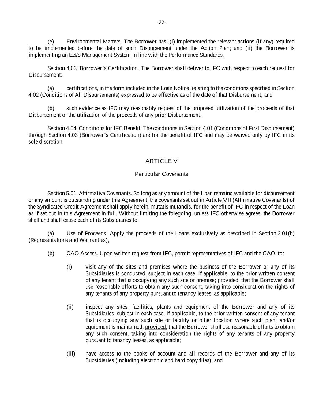 -22- (e) Environmental Matters. The Borrower has: (i) implemented the relevant actions (if any) required to be implemented before the date of such Disbursement under the Action Plan; and (ii) the Borrower is implementing an E&S Management System in line with the Performance Standards. Section 4.03. Borrower’s Certification. The Borrower shall deliver to IFC with respect to each request for Disbursement: (a) certifications, in the form included in the Loan Notice, relating to the conditions specified in Section 4.02 (Conditions of All Disbursements) expressed to be effective as of the date of that Disbursement; and (b) such evidence as IFC may reasonably request of the proposed utilization of the proceeds of that Disbursement or the utilization of the proceeds of any prior Disbursement. Section 4.04. Conditions for IFC Benefit. The conditions in Section 4.01 (Conditions of First Disbursement) through Section 4.03 (Borrower’s Certification) are for the benefit of IFC and may be waived only by IFC in its sole discretion. ARTICLE V Particular Covenants Section 5.01. Affirmative Covenants. So long as any amount of the Loan remains available for disbursement or any amount is outstanding under this Agreement, the covenants set out in Article VII (Affirmative Covenants) of the Syndicated Credit Agreement shall apply herein, mutatis mutandis, for the benefit of IFC in respect of the Loan as if set out in this Agreement in full. Without limiting the foregoing, unless IFC otherwise agrees, the Borrower shall and shall cause each of its Subsidiaries to: (a) Use of Proceeds. Apply the proceeds of the Loans exclusively as described in Section 3.01(h) (Representations and Warranties); (b) CAO Access. Upon written request from IFC, permit representatives of IFC and the CAO, to: (i) visit any of the sites and premises where the business of the Borrower or any of its Subsidiaries is conducted, subject in each case, if applicable, to the prior written consent of any tenant that is occupying any such site or premise; provided, that the Borrower shall use reasonable efforts to obtain any such consent, taking into consideration the rights of any tenants of any property pursuant to tenancy leases, as applicable; (ii) inspect any sites, facilities, plants and equipment of the Borrower and any of its Subsidiaries, subject in each case, if applicable, to the prior written consent of any tenant that is occupying any such site or facility or other location where such plant and/or equipment is maintained; provided, that the Borrower shall use reasonable efforts to obtain any such consent, taking into consideration the rights of any tenants of any property pursuant to tenancy leases, as applicable; (iii) have access to the books of account and all records of the Borrower and any of its Subsidiaries (including electronic and hard copy files); and