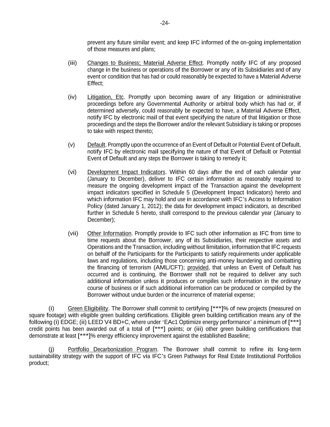 -24- prevent any future similar event; and keep IFC informed of the on-going implementation of those measures and plans; (iii) Changes to Business; Material Adverse Effect. Promptly notify IFC of any proposed change in the business or operations of the Borrower or any of its Subsidiaries and of any event or condition that has had or could reasonably be expected to have a Material Adverse Effect; (iv) Litigation, Etc. Promptly upon becoming aware of any litigation or administrative proceedings before any Governmental Authority or arbitral body which has had or, if determined adversely, could reasonably be expected to have, a Material Adverse Effect, notify IFC by electronic mail of that event specifying the nature of that litigation or those proceedings and the steps the Borrower and/or the relevant Subsidiary is taking or proposes to take with respect thereto; (v) Default. Promptly upon the occurrence of an Event of Default or Potential Event of Default, notify IFC by electronic mail specifying the nature of that Event of Default or Potential Event of Default and any steps the Borrower is taking to remedy it; (vi) Development Impact Indicators. Within 60 days after the end of each calendar year (January to December), deliver to IFC certain information as reasonably required to measure the ongoing development impact of the Transaction against the development impact indicators specified in Schedule 5 (Development Impact Indicators) hereto and which information IFC may hold and use in accordance with IFC’s Access to Information Policy (dated January 1, 2012); the data for development impact indicators, as described further in Schedule 5 hereto, shall correspond to the previous calendar year (January to December); (vii) Other Information. Promptly provide to IFC such other information as IFC from time to time requests about the Borrower, any of its Subsidiaries, their respective assets and Operations and the Transaction, including without limitation, information that IFC requests on behalf of the Participants for the Participants to satisfy requirements under applicable laws and regulations, including those concerning anti-money laundering and combatting the financing of terrorism (AML/CFT); provided, that unless an Event of Default has occurred and is continuing, the Borrower shall not be required to deliver any such additional information unless it produces or compiles such information in the ordinary course of business or if such additional information can be produced or compiled by the Borrower without undue burden or the incurrence of material expense; (i) Green Eligibility. The Borrower shall commit to certifying [***]% of new projects (measured on square footage) with eligible green building certifications. Eligible green building certification means any of the following (i) EDGE; (ii) LEED V4 BD+C, where under ‘EAc1 Optimize energy performance’ a minimum of [***] credit points has been awarded out of a total of [***] points; or (iii) other green building certifications that demonstrate at least [***]% energy efficiency improvement against the established Baseline; (j) Portfolio Decarbonization Program. The Borrower shall commit to refine its long-term sustainability strategy with the support of IFC via IFC’s Green Pathways for Real Estate Institutional Portfolios product;