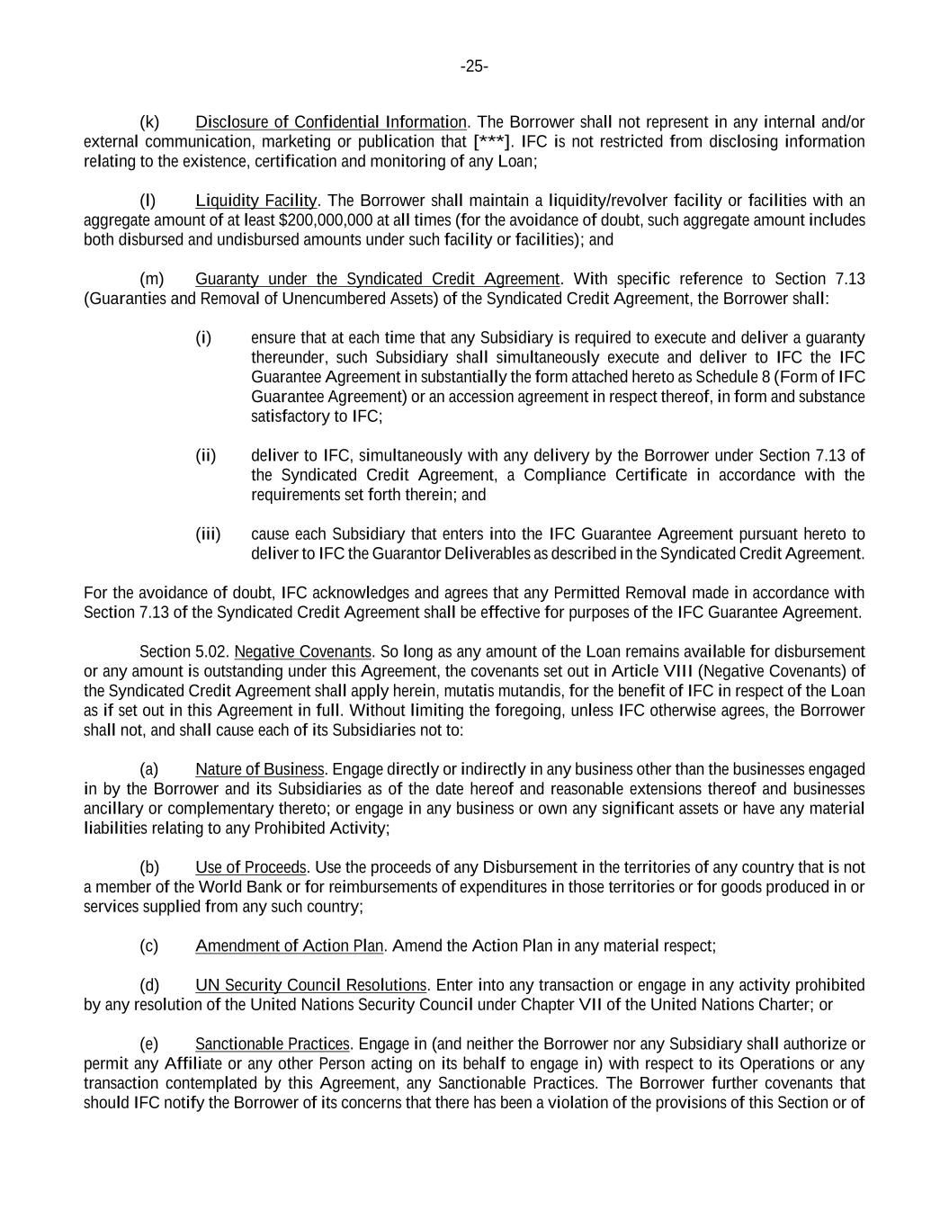 -25- (k) Disclosure of Confidential Information. The Borrower shall not represent in any internal and/or external communication, marketing or publication that [***]. IFC is not restricted from disclosing information relating to the existence, certification and monitoring of any Loan; (l) Liquidity Facility. The Borrower shall maintain a liquidity/revolver facility or facilities with an aggregate amount of at least $200,000,000 at all times (for the avoidance of doubt, such aggregate amount includes both disbursed and undisbursed amounts under such facility or facilities); and (m) Guaranty under the Syndicated Credit Agreement. With specific reference to Section 7.13 (Guaranties and Removal of Unencumbered Assets) of the Syndicated Credit Agreement, the Borrower shall: (i) ensure that at each time that any Subsidiary is required to execute and deliver a guaranty thereunder, such Subsidiary shall simultaneously execute and deliver to IFC the IFC Guarantee Agreement in substantially the form attached hereto as Schedule 8 (Form of IFC Guarantee Agreement) or an accession agreement in respect thereof, in form and substance satisfactory to IFC; (ii) deliver to IFC, simultaneously with any delivery by the Borrower under Section 7.13 of the Syndicated Credit Agreement, a Compliance Certificate in accordance with the requirements set forth therein; and (iii) cause each Subsidiary that enters into the IFC Guarantee Agreement pursuant hereto to deliver to IFC the Guarantor Deliverables as described in the Syndicated Credit Agreement. For the avoidance of doubt, IFC acknowledges and agrees that any Permitted Removal made in accordance with Section 7.13 of the Syndicated Credit Agreement shall be effective for purposes of the IFC Guarantee Agreement. Section 5.02. Negative Covenants. So long as any amount of the Loan remains available for disbursement or any amount is outstanding under this Agreement, the covenants set out in Article VIII (Negative Covenants) of the Syndicated Credit Agreement shall apply herein, mutatis mutandis, for the benefit of IFC in respect of the Loan as if set out in this Agreement in full. Without limiting the foregoing, unless IFC otherwise agrees, the Borrower shall not, and shall cause each of its Subsidiaries not to: (a) Nature of Business. Engage directly or indirectly in any business other than the businesses engaged in by the Borrower and its Subsidiaries as of the date hereof and reasonable extensions thereof and businesses ancillary or complementary thereto; or engage in any business or own any significant assets or have any material liabilities relating to any Prohibited Activity; (b) Use of Proceeds. Use the proceeds of any Disbursement in the territories of any country that is not a member of the World Bank or for reimbursements of expenditures in those territories or for goods produced in or services supplied from any such country; (c) Amendment of Action Plan. Amend the Action Plan in any material respect; (d) UN Security Council Resolutions. Enter into any transaction or engage in any activity prohibited by any resolution of the United Nations Security Council under Chapter VII of the United Nations Charter; or (e) Sanctionable Practices. Engage in (and neither the Borrower nor any Subsidiary shall authorize or permit any Affiliate or any other Person acting on its behalf to engage in) with respect to its Operations or any transaction contemplated by this Agreement, any Sanctionable Practices. The Borrower further covenants that should IFC notify the Borrower of its concerns that there has been a violation of the provisions of this Section or of
