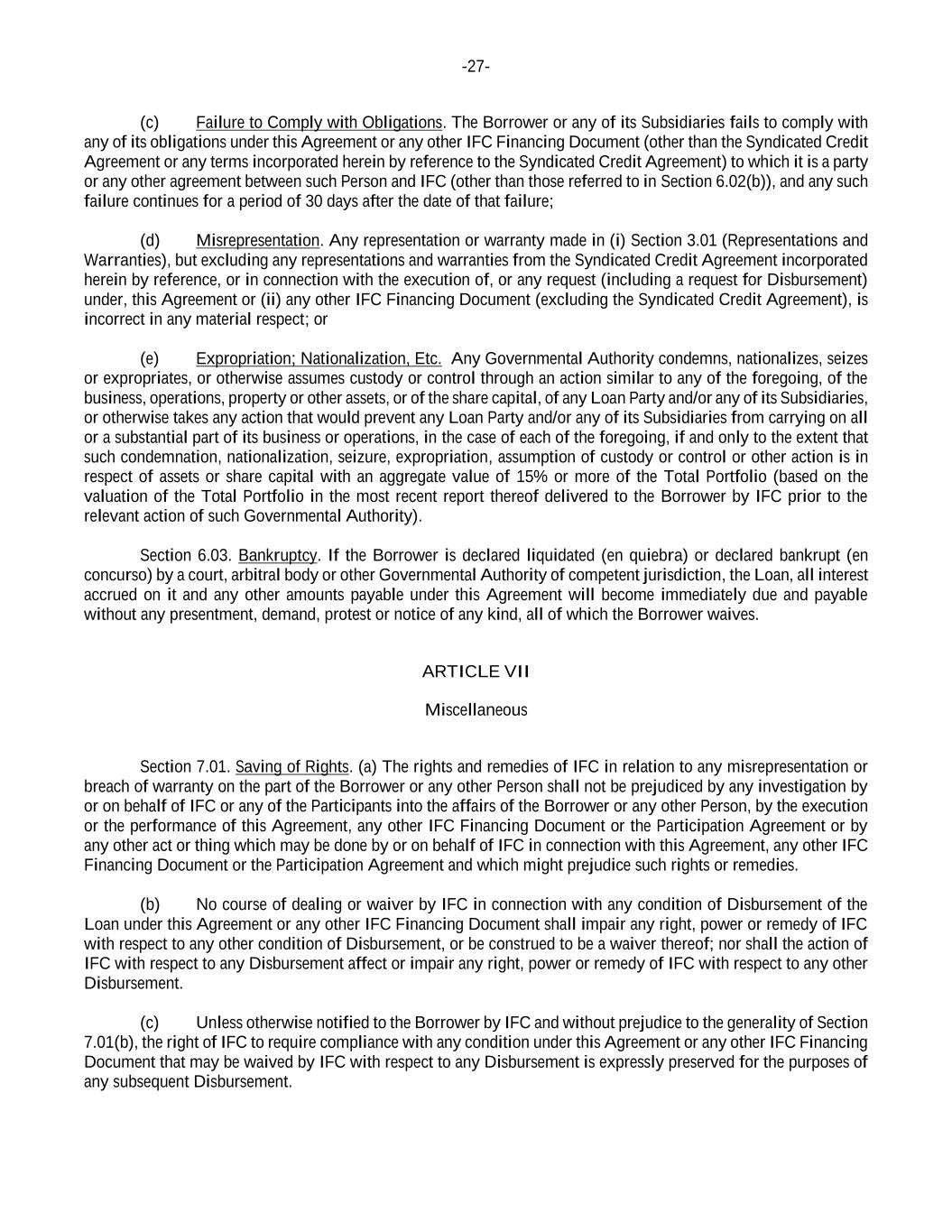 -27- (c) Failure to Comply with Obligations. The Borrower or any of its Subsidiaries fails to comply with any of its obligations under this Agreement or any other IFC Financing Document (other than the Syndicated Credit Agreement or any terms incorporated herein by reference to the Syndicated Credit Agreement) to which it is a party or any other agreement between such Person and IFC (other than those referred to in Section 6.02(b)), and any such failure continues for a period of 30 days after the date of that failure; (d) Misrepresentation. Any representation or warranty made in (i) Section 3.01 (Representations and Warranties), but excluding any representations and warranties from the Syndicated Credit Agreement incorporated herein by reference, or in connection with the execution of, or any request (including a request for Disbursement) under, this Agreement or (ii) any other IFC Financing Document (excluding the Syndicated Credit Agreement), is incorrect in any material respect; or (e) Expropriation; Nationalization, Etc. Any Governmental Authority condemns, nationalizes, seizes or expropriates, or otherwise assumes custody or control through an action similar to any of the foregoing, of the business, operations, property or other assets, or of the share capital, of any Loan Party and/or any of its Subsidiaries, or otherwise takes any action that would prevent any Loan Party and/or any of its Subsidiaries from carrying on all or a substantial part of its business or operations, in the case of each of the foregoing, if and only to the extent that such condemnation, nationalization, seizure, expropriation, assumption of custody or control or other action is in respect of assets or share capital with an aggregate value of 15% or more of the Total Portfolio (based on the valuation of the Total Portfolio in the most recent report thereof delivered to the Borrower by IFC prior to the relevant action of such Governmental Authority). Section 6.03. Bankruptcy. If the Borrower is declared liquidated (en quiebra) or declared bankrupt (en concurso) by a court, arbitral body or other Governmental Authority of competent jurisdiction, the Loan, all interest accrued on it and any other amounts payable under this Agreement will become immediately due and payable without any presentment, demand, protest or notice of any kind, all of which the Borrower waives. ARTICLE VII Miscellaneous Section 7.01. Saving of Rights. (a) The rights and remedies of IFC in relation to any misrepresentation or breach of warranty on the part of the Borrower or any other Person shall not be prejudiced by any investigation by or on behalf of IFC or any of the Participants into the affairs of the Borrower or any other Person, by the execution or the performance of this Agreement, any other IFC Financing Document or the Participation Agreement or by any other act or thing which may be done by or on behalf of IFC in connection with this Agreement, any other IFC Financing Document or the Participation Agreement and which might prejudice such rights or remedies. (b) No course of dealing or waiver by IFC in connection with any condition of Disbursement of the Loan under this Agreement or any other IFC Financing Document shall impair any right, power or remedy of IFC with respect to any other condition of Disbursement, or be construed to be a waiver thereof; nor shall the action of IFC with respect to any Disbursement affect or impair any right, power or remedy of IFC with respect to any other Disbursement. (c) Unless otherwise notified to the Borrower by IFC and without prejudice to the generality of Section 7.01(b), the right of IFC to require compliance with any condition under this Agreement or any other IFC Financing Document that may be waived by IFC with respect to any Disbursement is expressly preserved for the purposes of any subsequent Disbursement.