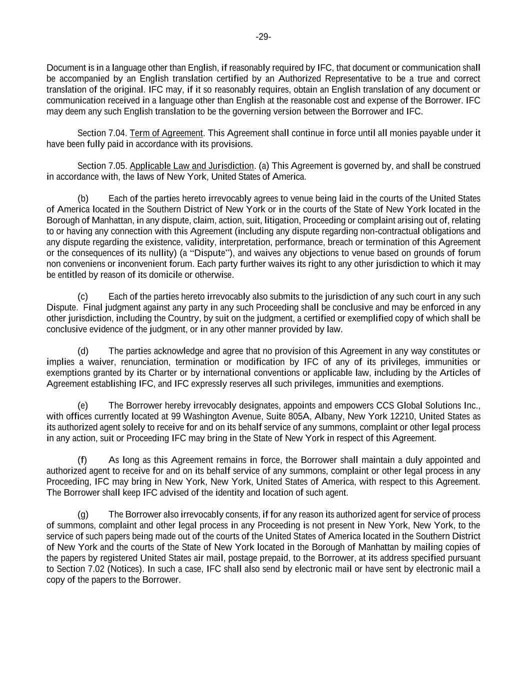 -29- Document is in a language other than English, if reasonably required by IFC, that document or communication shall be accompanied by an English translation certified by an Authorized Representative to be a true and correct translation of the original. IFC may, if it so reasonably requires, obtain an English translation of any document or communication received in a language other than English at the reasonable cost and expense of the Borrower. IFC may deem any such English translation to be the governing version between the Borrower and IFC. Section 7.04. Term of Agreement. This Agreement shall continue in force until all monies payable under it have been fully paid in accordance with its provisions. Section 7.05. Applicable Law and Jurisdiction. (a) This Agreement is governed by, and shall be construed in accordance with, the laws of New York, United States of America. (b) Each of the parties hereto irrevocably agrees to venue being laid in the courts of the United States of America located in the Southern District of New York or in the courts of the State of New York located in the Borough of Manhattan, in any dispute, claim, action, suit, litigation, Proceeding or complaint arising out of, relating to or having any connection with this Agreement (including any dispute regarding non-contractual obligations and any dispute regarding the existence, validity, interpretation, performance, breach or termination of this Agreement or the consequences of its nullity) (a “Dispute”), and waives any objections to venue based on grounds of forum non conveniens or inconvenient forum. Each party further waives its right to any other jurisdiction to which it may be entitled by reason of its domicile or otherwise. (c) Each of the parties hereto irrevocably also submits to the jurisdiction of any such court in any such Dispute. Final judgment against any party in any such Proceeding shall be conclusive and may be enforced in any other jurisdiction, including the Country, by suit on the judgment, a certified or exemplified copy of which shall be conclusive evidence of the judgment, or in any other manner provided by law. (d) The parties acknowledge and agree that no provision of this Agreement in any way constitutes or implies a waiver, renunciation, termination or modification by IFC of any of its privileges, immunities or exemptions granted by its Charter or by international conventions or applicable law, including by the Articles of Agreement establishing IFC, and IFC expressly reserves all such privileges, immunities and exemptions. (e) The Borrower hereby irrevocably designates, appoints and empowers CCS Global Solutions Inc., with offices currently located at 99 Washington Avenue, Suite 805A, Albany, New York 12210, United States as its authorized agent solely to receive for and on its behalf service of any summons, complaint or other legal process in any action, suit or Proceeding IFC may bring in the State of New York in respect of this Agreement. (f) As long as this Agreement remains in force, the Borrower shall maintain a duly appointed and authorized agent to receive for and on its behalf service of any summons, complaint or other legal process in any Proceeding, IFC may bring in New York, New York, United States of America, with respect to this Agreement. The Borrower shall keep IFC advised of the identity and location of such agent. (g) The Borrower also irrevocably consents, if for any reason its authorized agent for service of process of summons, complaint and other legal process in any Proceeding is not present in New York, New York, to the service of such papers being made out of the courts of the United States of America located in the Southern District of New York and the courts of the State of New York located in the Borough of Manhattan by mailing copies of the papers by registered United States air mail, postage prepaid, to the Borrower, at its address specified pursuant to Section 7.02 (Notices). In such a case, IFC shall also send by electronic mail or have sent by electronic mail a copy of the papers to the Borrower.