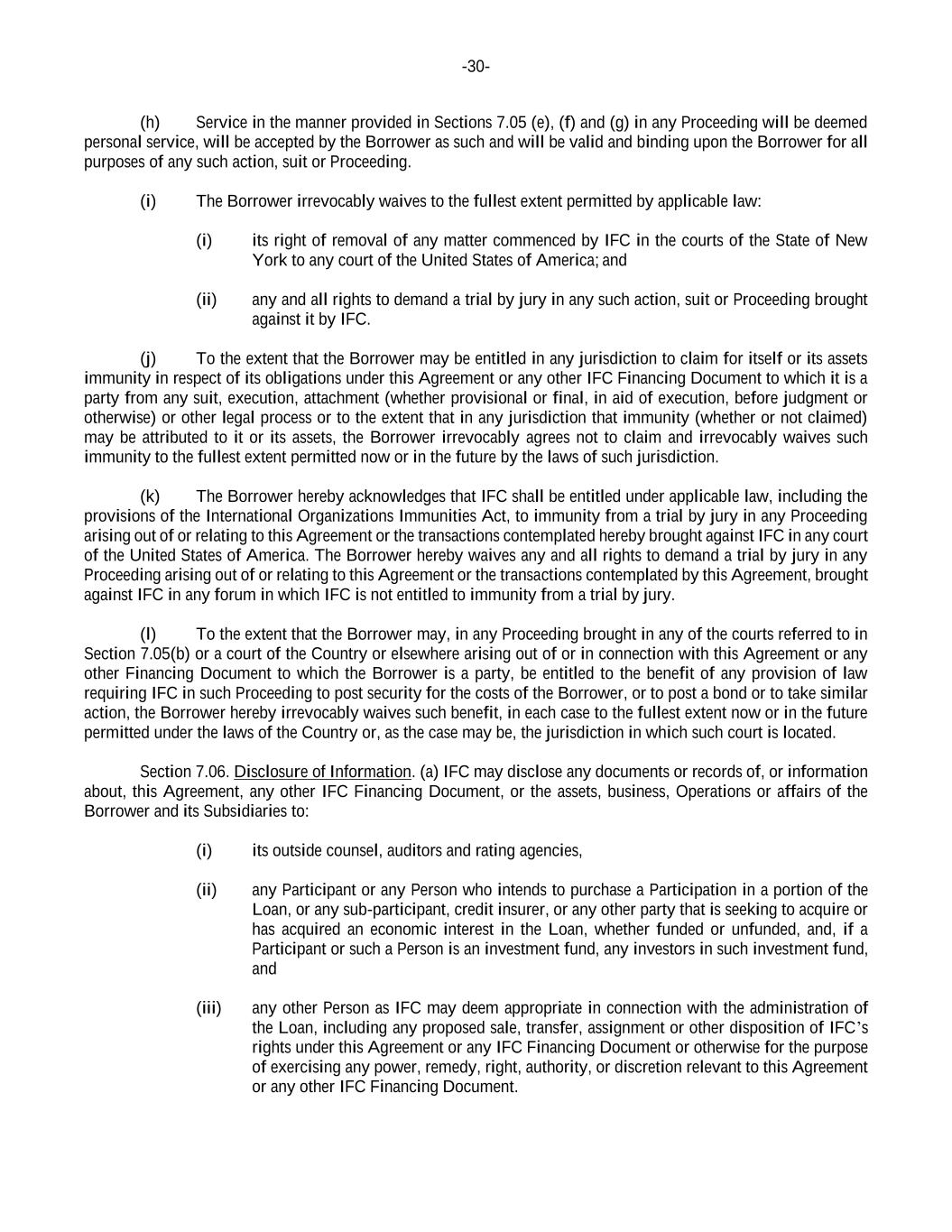 -30- (h) Service in the manner provided in Sections 7.05 (e), (f) and (g) in any Proceeding will be deemed personal service, will be accepted by the Borrower as such and will be valid and binding upon the Borrower for all purposes of any such action, suit or Proceeding. (i) The Borrower irrevocably waives to the fullest extent permitted by applicable law: (i) its right of removal of any matter commenced by IFC in the courts of the State of New York to any court of the United States of America; and (ii) any and all rights to demand a trial by jury in any such action, suit or Proceeding brought against it by IFC. (j) To the extent that the Borrower may be entitled in any jurisdiction to claim for itself or its assets immunity in respect of its obligations under this Agreement or any other IFC Financing Document to which it is a party from any suit, execution, attachment (whether provisional or final, in aid of execution, before judgment or otherwise) or other legal process or to the extent that in any jurisdiction that immunity (whether or not claimed) may be attributed to it or its assets, the Borrower irrevocably agrees not to claim and irrevocably waives such immunity to the fullest extent permitted now or in the future by the laws of such jurisdiction. (k) The Borrower hereby acknowledges that IFC shall be entitled under applicable law, including the provisions of the International Organizations Immunities Act, to immunity from a trial by jury in any Proceeding arising out of or relating to this Agreement or the transactions contemplated hereby brought against IFC in any court of the United States of America. The Borrower hereby waives any and all rights to demand a trial by jury in any Proceeding arising out of or relating to this Agreement or the transactions contemplated by this Agreement, brought against IFC in any forum in which IFC is not entitled to immunity from a trial by jury. (l) To the extent that the Borrower may, in any Proceeding brought in any of the courts referred to in Section 7.05(b) or a court of the Country or elsewhere arising out of or in connection with this Agreement or any other Financing Document to which the Borrower is a party, be entitled to the benefit of any provision of law requiring IFC in such Proceeding to post security for the costs of the Borrower, or to post a bond or to take similar action, the Borrower hereby irrevocably waives such benefit, in each case to the fullest extent now or in the future permitted under the laws of the Country or, as the case may be, the jurisdiction in which such court is located. Section 7.06. Disclosure of Information. (a) IFC may disclose any documents or records of, or information about, this Agreement, any other IFC Financing Document, or the assets, business, Operations or affairs of the Borrower and its Subsidiaries to: (i) its outside counsel, auditors and rating agencies, (ii) any Participant or any Person who intends to purchase a Participation in a portion of the Loan, or any sub-participant, credit insurer, or any other party that is seeking to acquire or has acquired an economic interest in the Loan, whether funded or unfunded, and, if a Participant or such a Person is an investment fund, any investors in such investment fund, and (iii) any other Person as IFC may deem appropriate in connection with the administration of the Loan, including any proposed sale, transfer, assignment or other disposition of IFC’s rights under this Agreement or any IFC Financing Document or otherwise for the purpose of exercising any power, remedy, right, authority, or discretion relevant to this Agreement or any other IFC Financing Document.