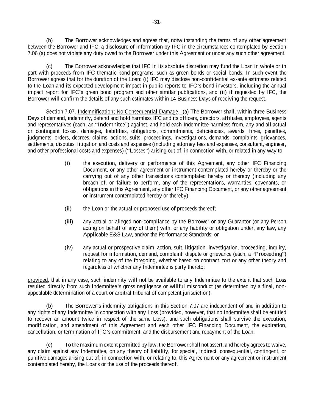 -31- (b) The Borrower acknowledges and agrees that, notwithstanding the terms of any other agreement between the Borrower and IFC, a disclosure of information by IFC in the circumstances contemplated by Section 7.06 (a) does not violate any duty owed to the Borrower under this Agreement or under any such other agreement. (c) The Borrower acknowledges that IFC in its absolute discretion may fund the Loan in whole or in part with proceeds from IFC thematic bond programs, such as green bonds or social bonds. In such event the Borrower agrees that for the duration of the Loan: (i) IFC may disclose non-confidential ex-ante estimates related to the Loan and its expected development impact in public reports to IFC’s bond investors, including the annual impact report for IFC’s green bond program and other similar publications, and (ii) if requested by IFC, the Borrower will confirm the details of any such estimates within 14 Business Days of receiving the request. Section 7.07. Indemnification; No Consequential Damage. (a) The Borrower shall, within three Business Days of demand, indemnify, defend and hold harmless IFC and its officers, directors, affiliates, employees, agents and representatives (each, an “Indemnitee”) against, and hold each Indemnitee harmless from, any and all actual or contingent losses, damages, liabilities, obligations, commitments, deficiencies, awards, fines, penalties, judgments, orders, decrees, claims, actions, suits, proceedings, investigations, demands, complaints, grievances, settlements, disputes, litigation and costs and expenses (including attorney fees and expenses, consultant, engineer, and other professional costs and expenses) (“Losses”) arising out of, in connection with, or related in any way to: (i) the execution, delivery or performance of this Agreement, any other IFC Financing Document, or any other agreement or instrument contemplated hereby or thereby or the carrying out of any other transactions contemplated hereby or thereby (including any breach of, or failure to perform, any of the representations, warranties, covenants, or obligations in this Agreement, any other IFC Financing Document, or any other agreement or instrument contemplated hereby or thereby); (ii) the Loan or the actual or proposed use of proceeds thereof; (iii) any actual or alleged non-compliance by the Borrower or any Guarantor (or any Person acting on behalf of any of them) with, or any liability or obligation under, any law, any Applicable E&S Law, and/or the Performance Standards; or (iv) any actual or prospective claim, action, suit, litigation, investigation, proceeding, inquiry, request for information, demand, complaint, dispute or grievance (each, a “Proceeding”) relating to any of the foregoing, whether based on contract, tort or any other theory and regardless of whether any Indemnitee is party thereto; provided, that in any case, such indemnity will not be available to any Indemnitee to the extent that such Loss resulted directly from such Indemnitee’s gross negligence or willful misconduct (as determined by a final, non- appealable determination of a court or arbitral tribunal of competent jurisdiction). (b) The Borrower’s indemnity obligations in this Section 7.07 are independent of and in addition to any rights of any Indemnitee in connection with any Loss (provided, however, that no Indemnitee shall be entitled to recover an amount twice in respect of the same Loss), and such obligations shall survive the execution, modification, and amendment of this Agreement and each other IFC Financing Document, the expiration, cancellation, or termination of IFC’s commitment, and the disbursement and repayment of the Loan. (c) To the maximum extent permitted by law, the Borrower shall not assert, and hereby agrees to waive, any claim against any Indemnitee, on any theory of liability, for special, indirect, consequential, contingent, or punitive damages arising out of, in connection with, or relating to, this Agreement or any agreement or instrument contemplated hereby, the Loans or the use of the proceeds thereof.