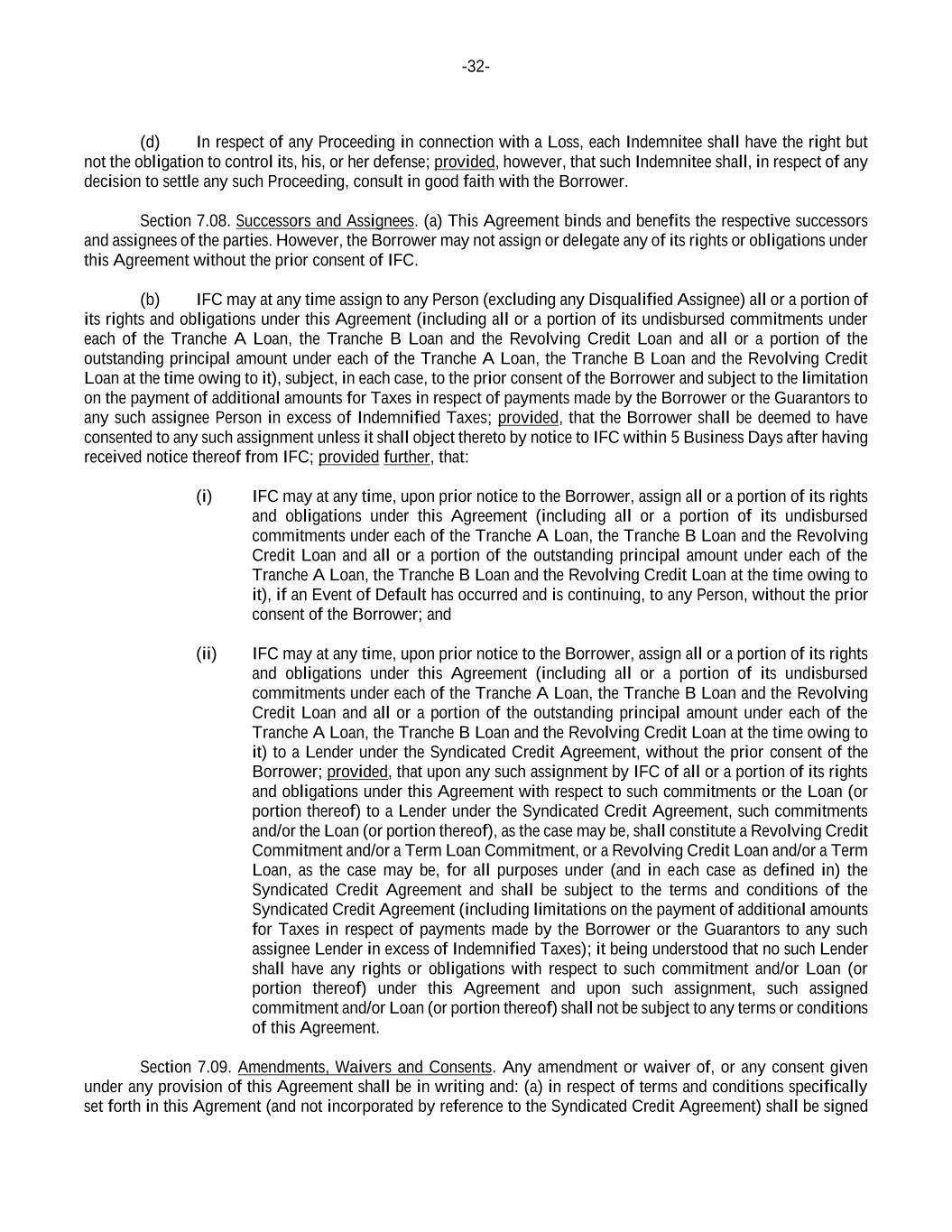 -32- (d) In respect of any Proceeding in connection with a Loss, each Indemnitee shall have the right but not the obligation to control its, his, or her defense; provided, however, that such Indemnitee shall, in respect of any decision to settle any such Proceeding, consult in good faith with the Borrower. Section 7.08. Successors and Assignees. (a) This Agreement binds and benefits the respective successors and assignees of the parties. However, the Borrower may not assign or delegate any of its rights or obligations under this Agreement without the prior consent of IFC. (b) IFC may at any time assign to any Person (excluding any Disqualified Assignee) all or a portion of its rights and obligations under this Agreement (including all or a portion of its undisbursed commitments under each of the Tranche A Loan, the Tranche B Loan and the Revolving Credit Loan and all or a portion of the outstanding principal amount under each of the Tranche A Loan, the Tranche B Loan and the Revolving Credit Loan at the time owing to it), subject, in each case, to the prior consent of the Borrower and subject to the limitation on the payment of additional amounts for Taxes in respect of payments made by the Borrower or the Guarantors to any such assignee Person in excess of Indemnified Taxes; provided, that the Borrower shall be deemed to have consented to any such assignment unless it shall object thereto by notice to IFC within 5 Business Days after having received notice thereof from IFC; provided further, that: (i) IFC may at any time, upon prior notice to the Borrower, assign all or a portion of its rights and obligations under this Agreement (including all or a portion of its undisbursed commitments under each of the Tranche A Loan, the Tranche B Loan and the Revolving Credit Loan and all or a portion of the outstanding principal amount under each of the Tranche A Loan, the Tranche B Loan and the Revolving Credit Loan at the time owing to it), if an Event of Default has occurred and is continuing, to any Person, without the prior consent of the Borrower; and (ii) IFC may at any time, upon prior notice to the Borrower, assign all or a portion of its rights and obligations under this Agreement (including all or a portion of its undisbursed commitments under each of the Tranche A Loan, the Tranche B Loan and the Revolving Credit Loan and all or a portion of the outstanding principal amount under each of the Tranche A Loan, the Tranche B Loan and the Revolving Credit Loan at the time owing to it) to a Lender under the Syndicated Credit Agreement, without the prior consent of the Borrower; provided, that upon any such assignment by IFC of all or a portion of its rights and obligations under this Agreement with respect to such commitments or the Loan (or portion thereof) to a Lender under the Syndicated Credit Agreement, such commitments and/or the Loan (or portion thereof), as the case may be, shall constitute a Revolving Credit Commitment and/or a Term Loan Commitment, or a Revolving Credit Loan and/or a Term Loan, as the case may be, for all purposes under (and in each case as defined in) the Syndicated Credit Agreement and shall be subject to the terms and conditions of the Syndicated Credit Agreement (including limitations on the payment of additional amounts for Taxes in respect of payments made by the Borrower or the Guarantors to any such assignee Lender in excess of Indemnified Taxes); it being understood that no such Lender shall have any rights or obligations with respect to such commitment and/or Loan (or portion thereof) under this Agreement and upon such assignment, such assigned commitment and/or Loan (or portion thereof) shall not be subject to any terms or conditions of this Agreement. Section 7.09. Amendments, Waivers and Consents. Any amendment or waiver of, or any consent given under any provision of this Agreement shall be in writing and: (a) in respect of terms and conditions specifically set forth in this Agrement (and not incorporated by reference to the Syndicated Credit Agreement) shall be signed