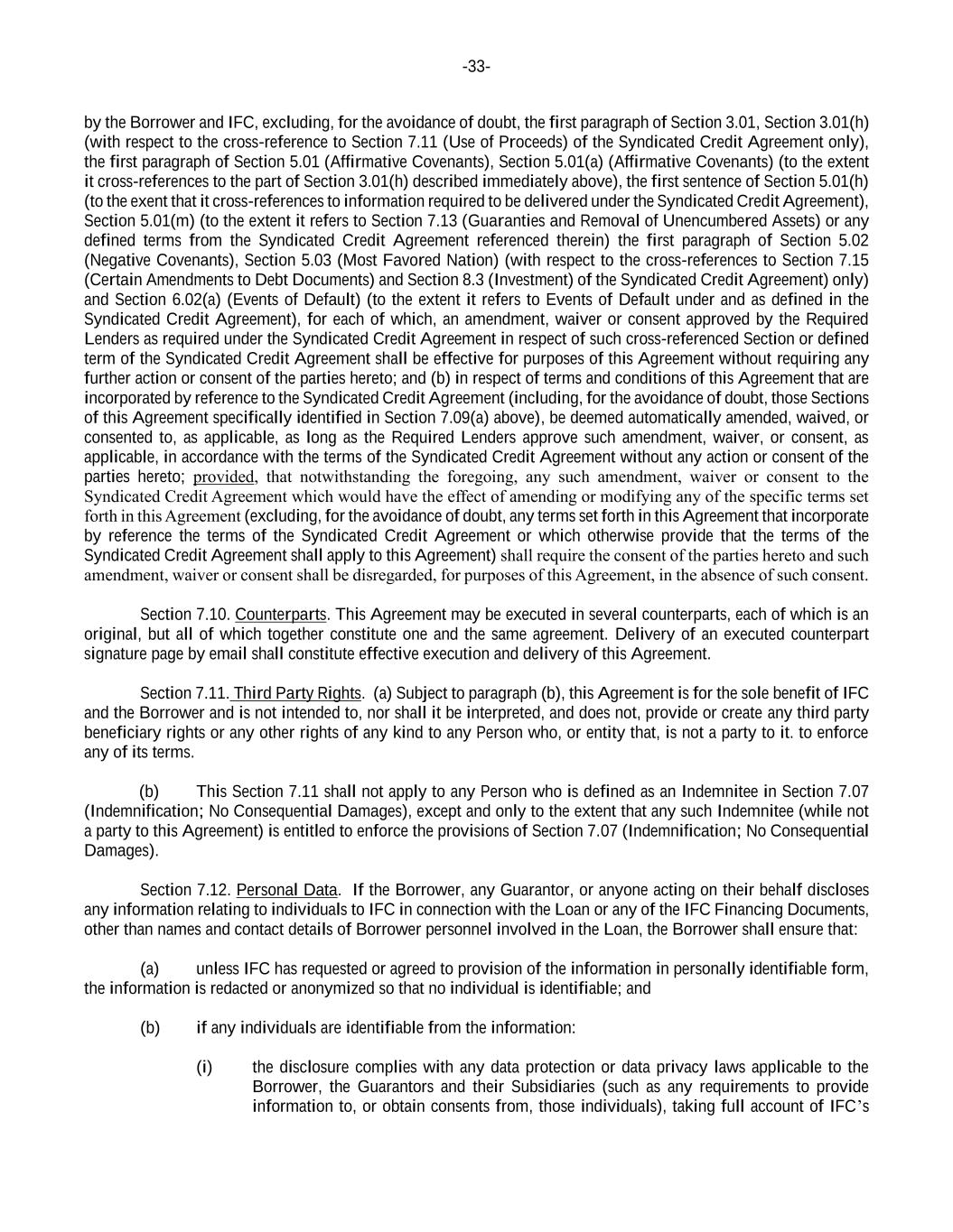 -33- by the Borrower and IFC, excluding, for the avoidance of doubt, the first paragraph of Section 3.01, Section 3.01(h) (with respect to the cross-reference to Section 7.11 (Use of Proceeds) of the Syndicated Credit Agreement only), the first paragraph of Section 5.01 (Affirmative Covenants), Section 5.01(a) (Affirmative Covenants) (to the extent it cross-references to the part of Section 3.01(h) described immediately above), the first sentence of Section 5.01(h) (to the exent that it cross-references to information required to be delivered under the Syndicated Credit Agreement), Section 5.01(m) (to the extent it refers to Section 7.13 (Guaranties and Removal of Unencumbered Assets) or any defined terms from the Syndicated Credit Agreement referenced therein) the first paragraph of Section 5.02 (Negative Covenants), Section 5.03 (Most Favored Nation) (with respect to the cross-references to Section 7.15 (Certain Amendments to Debt Documents) and Section 8.3 (Investment) of the Syndicated Credit Agreement) only) and Section 6.02(a) (Events of Default) (to the extent it refers to Events of Default under and as defined in the Syndicated Credit Agreement), for each of which, an amendment, waiver or consent approved by the Required Lenders as required under the Syndicated Credit Agreement in respect of such cross-referenced Section or defined term of the Syndicated Credit Agreement shall be effective for purposes of this Agreement without requiring any further action or consent of the parties hereto; and (b) in respect of terms and conditions of this Agreement that are incorporated by reference to the Syndicated Credit Agreement (including, for the avoidance of doubt, those Sections of this Agreement specifically identified in Section 7.09(a) above), be deemed automatically amended, waived, or consented to, as applicable, as long as the Required Lenders approve such amendment, waiver, or consent, as applicable, in accordance with the terms of the Syndicated Credit Agreement without any action or consent of the parties hereto; provided, that notwithstanding the foregoing, any such amendment, waiver or consent to the Syndicated Credit Agreement which would have the effect of amending or modifying any of the specific terms set forth in this Agreement (excluding, for the avoidance of doubt, any terms set forth in this Agreement that incorporate by reference the terms of the Syndicated Credit Agreement or which otherwise provide that the terms of the Syndicated Credit Agreement shall apply to this Agreement) shall require the consent of the parties hereto and such amendment, waiver or consent shall be disregarded, for purposes of this Agreement, in the absence of such consent. Section 7.10. Counterparts. This Agreement may be executed in several counterparts, each of which is an original, but all of which together constitute one and the same agreement. Delivery of an executed counterpart signature page by email shall constitute effective execution and delivery of this Agreement. Section 7.11. Third Party Rights. (a) Subject to paragraph (b), this Agreement is for the sole benefit of IFC and the Borrower and is not intended to, nor shall it be interpreted, and does not, provide or create any third party beneficiary rights or any other rights of any kind to any Person who, or entity that, is not a party to it. to enforce any of its terms. (b) This Section 7.11 shall not apply to any Person who is defined as an Indemnitee in Section 7.07 (Indemnification; No Consequential Damages), except and only to the extent that any such Indemnitee (while not a party to this Agreement) is entitled to enforce the provisions of Section 7.07 (Indemnification; No Consequential Damages). Section 7.12. Personal Data. If the Borrower, any Guarantor, or anyone acting on their behalf discloses any information relating to individuals to IFC in connection with the Loan or any of the IFC Financing Documents, other than names and contact details of Borrower personnel involved in the Loan, the Borrower shall ensure that: (a) unless IFC has requested or agreed to provision of the information in personally identifiable form, the information is redacted or anonymized so that no individual is identifiable; and (b) if any individuals are identifiable from the information: (i) the disclosure complies with any data protection or data privacy laws applicable to the Borrower, the Guarantors and their Subsidiaries (such as any requirements to provide information to, or obtain consents from, those individuals), taking full account of IFC’s