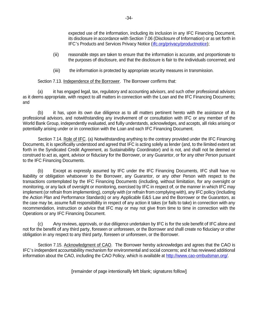 -34- expected use of the information, including its inclusion in any IFC Financing Document, its disclosure in accordance with Section 7.06 (Disclosure of Information) or as set forth in IFC’s Products and Services Privacy Notice (ifc.org/privacy/productnotice); (ii) reasonable steps are taken to ensure that the information is accurate, and proportionate to the purposes of disclosure, and that the disclosure is fair to the individuals concerned; and (iii) the information is protected by appropriate security measures in transmission. Section 7.13. Independence of the Borrower. The Borrower confirms that: (a) it has engaged legal, tax, regulatory and accounting advisors, and such other professional advisors as it deems appropriate, with respect to all matters in connection with the Loan and the IFC Financing Documents; and (b) it has, upon its own due diligence as to all matters pertinent hereto with the assistance of its professional advisors, and notwithstanding any involvement of or consultation with IFC or any member of the World Bank Group, independently evaluated, and fully understands, acknowledges, and accepts, all risks arising or potentially arising under or in connection with the Loan and each IFC Financing Document. Section 7.14. Role of IFC. (a) Notwithstanding anything to the contrary provided under the IFC Financing Documents, it is specifically understood and agreed that IFC is acting solely as lender (and, to the limited extent set forth in the Syndicated Credit Agreement, as Sustainability Coordinator) and is not, and shall not be deemed or construed to act as, agent, advisor or fiduciary for the Borrower, or any Guarantor, or for any other Person pursuant to the IFC Financing Documents. (b) Except as expressly assumed by IFC under the IFC Financing Documents, IFC shall have no liability or obligation whatsoever to the Borrower, any Guarantor, or any other Person with respect to the transactions contemplated by the IFC Financing Documents (including, without limitation, for any oversight or monitoring, or any lack of oversight or monitoring, exercised by IFC in respect of, or the manner in which IFC may implement (or refrain from implementing), comply with (or refrain from complying with), any IFC policy (including the Action Plan and Performance Standards) or any Applicable E&S Law and the Borrower or the Guarantors, as the case may be, assume full responsibility in respect of any action it takes (or fails to take) in connection with any recommendation, instruction or advice that IFC may or may not give from time to time in connection with the Operations or any IFC Financing Document. (c) Any reviews, approvals, or due diligence undertaken by IFC is for the sole benefit of IFC alone and not for the benefit of any third party, foreseen or unforeseen, or the Borrower and shall create no fiduciary or other obligation in any respect to any third party, foreseen or unforeseen, or the Borrower. Section 7.15. Acknowledgment of CAO. The Borrower hereby acknowledges and agrees that the CAO is IFC’s independent accountability mechanism for environmental and social concerns; and it has reviewed additional information about the CAO, including the CAO Policy, which is available at http://www.cao-ombudsman.org/. [remainder of page intentionally left blank; signatures follow]