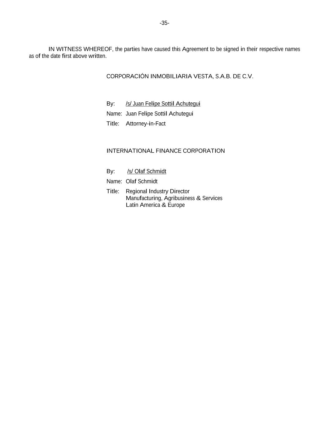 -35- IN WITNESS WHEREOF, the parties have caused this Agreement to be signed in their respective names as of the date first above written. CORPORACIÓN INMOBILIARIA VESTA, S.A.B. DE C.V. By: /s/ Juan Felipe Sottil Achutegui Name: Juan Felipe Sottil Achutegui Title: Attorney-in-Fact INTERNATIONAL FINANCE CORPORATION By: /s/ Olaf Schmidt Name: Olaf Schmidt Title: Regional Industry Director Manufacturing, Agribusiness & Services Latin America & Europe