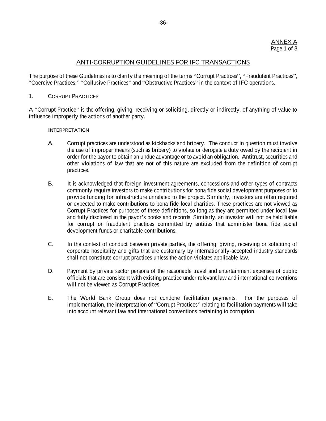 -36- ANNEX A Page 1 of 3 ANTI-CORRUPTION GUIDELINES FOR IFC TRANSACTIONS The purpose of these Guidelines is to clarify the meaning of the terms “Corrupt Practices”, “Fraudulent Practices”, “Coercive Practices,” “Collusive Practices” and “Obstructive Practices” in the context of IFC operations. 1. CORRUPT PRACTICES A “Corrupt Practice” is the offering, giving, receiving or soliciting, directly or indirectly, of anything of value to influence improperly the actions of another party. INTERPRETATION A. Corrupt practices are understood as kickbacks and bribery. The conduct in question must involve the use of improper means (such as bribery) to violate or derogate a duty owed by the recipient in order for the payor to obtain an undue advantage or to avoid an obligation. Antitrust, securities and other violations of law that are not of this nature are excluded from the definition of corrupt practices. B. It is acknowledged that foreign investment agreements, concessions and other types of contracts commonly require investors to make contributions for bona fide social development purposes or to provide funding for infrastructure unrelated to the project. Similarly, investors are often required or expected to make contributions to bona fide local charities. These practices are not viewed as Corrupt Practices for purposes of these definitions, so long as they are permitted under local law and fully disclosed in the payor’s books and records. Similarly, an investor will not be held liable for corrupt or fraudulent practices committed by entities that administer bona fide social development funds or charitable contributions. C. In the context of conduct between private parties, the offering, giving, receiving or soliciting of corporate hospitality and gifts that are customary by internationally-accepted industry standards shall not constitute corrupt practices unless the action violates applicable law. D. Payment by private sector persons of the reasonable travel and entertainment expenses of public officials that are consistent with existing practice under relevant law and international conventions will not be viewed as Corrupt Practices. E. The World Bank Group does not condone facilitation payments. For the purposes of implementation, the interpretation of “Corrupt Practices” relating to facilitation payments will take into account relevant law and international conventions pertaining to corruption.
