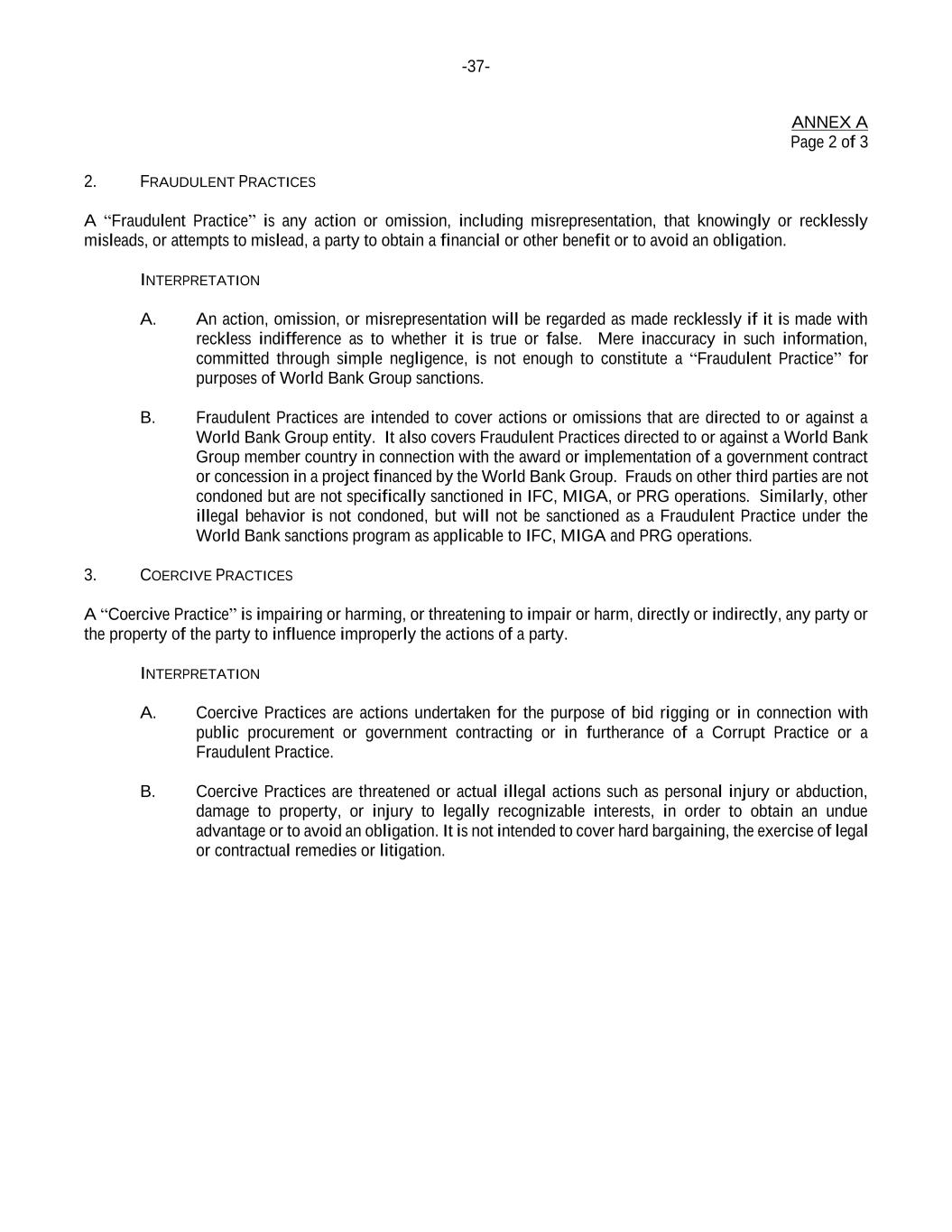 -37- ANNEX A Page 2 of 3 2. FRAUDULENT PRACTICES A “Fraudulent Practice” is any action or omission, including misrepresentation, that knowingly or recklessly misleads, or attempts to mislead, a party to obtain a financial or other benefit or to avoid an obligation. INTERPRETATION A. An action, omission, or misrepresentation will be regarded as made recklessly if it is made with reckless indifference as to whether it is true or false. Mere inaccuracy in such information, committed through simple negligence, is not enough to constitute a “Fraudulent Practice” for purposes of World Bank Group sanctions. B. Fraudulent Practices are intended to cover actions or omissions that are directed to or against a World Bank Group entity. It also covers Fraudulent Practices directed to or against a World Bank Group member country in connection with the award or implementation of a government contract or concession in a project financed by the World Bank Group. Frauds on other third parties are not condoned but are not specifically sanctioned in IFC, MIGA, or PRG operations. Similarly, other illegal behavior is not condoned, but will not be sanctioned as a Fraudulent Practice under the World Bank sanctions program as applicable to IFC, MIGA and PRG operations. 3. COERCIVE PRACTICES A “Coercive Practice” is impairing or harming, or threatening to impair or harm, directly or indirectly, any party or the property of the party to influence improperly the actions of a party. INTERPRETATION A. Coercive Practices are actions undertaken for the purpose of bid rigging or in connection with public procurement or government contracting or in furtherance of a Corrupt Practice or a Fraudulent Practice. B. Coercive Practices are threatened or actual illegal actions such as personal injury or abduction, damage to property, or injury to legally recognizable interests, in order to obtain an undue advantage or to avoid an obligation. It is not intended to cover hard bargaining, the exercise of legal or contractual remedies or litigation.