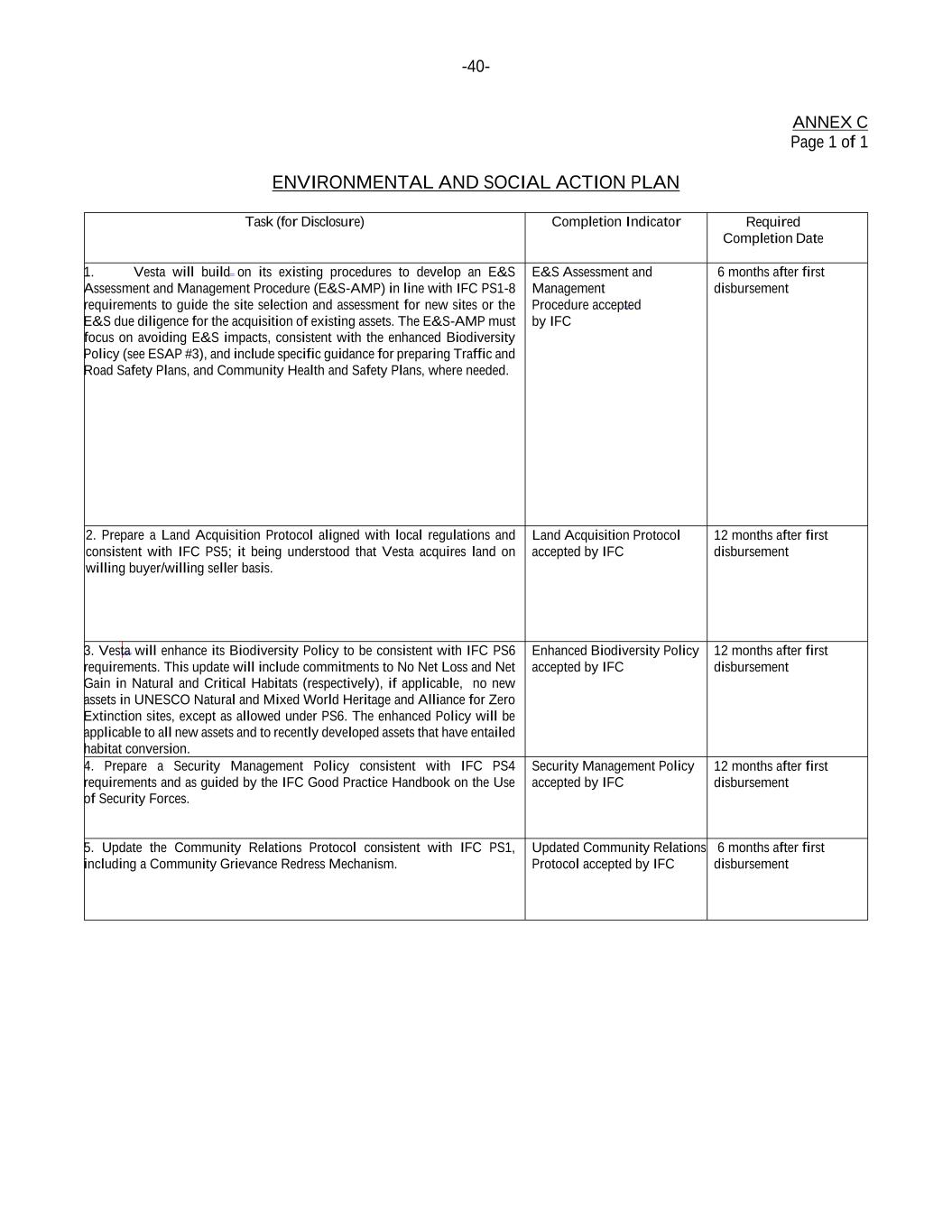 -40- ANNEX C Page 1 of 1 ENVIRONMENTAL AND SOCIAL ACTION PLAN Task (for Disclosure) Completion Indicator Required Completion Date 1. Vesta will build on its existing procedures to develop an E&S Assessment and Management Procedure (E&S-AMP) in line with IFC PS1-8 requirements to guide the site selection and assessment for new sites or the E&S due diligence for the acquisition of existing assets. The E&S-AMP must focus on avoiding E&S impacts, consistent with the enhanced Biodiversity Policy (see ESAP #3), and include specific guidance for preparing Traffic and Road Safety Plans, and Community Health and Safety Plans, where needed. E&S Assessment and Management Procedure accepted by IFC 6 months after first disbursement 2. Prepare a Land Acquisition Protocol aligned with local regulations and consistent with IFC PS5; it being understood that Vesta acquires land on willing buyer/willing seller basis. Land Acquisition Protocol accepted by IFC 12 months after first disbursement 3. Vesta will enhance its Biodiversity Policy to be consistent with IFC PS6 requirements. This update will include commitments to No Net Loss and Net Gain in Natural and Critical Habitats (respectively), if applicable, no new assets in UNESCO Natural and Mixed World Heritage and Alliance for Zero Extinction sites, except as allowed under PS6. The enhanced Policy will be applicable to all new assets and to recently developed assets that have entailed habitat conversion. Enhanced Biodiversity Policy accepted by IFC 12 months after first disbursement 4. Prepare a Security Management Policy consistent with IFC PS4 requirements and as guided by the IFC Good Practice Handbook on the Use of Security Forces. Security Management Policy accepted by IFC 12 months after first disbursement 5. Update the Community Relations Protocol consistent with IFC PS1, including a Community Grievance Redress Mechanism. Updated Community Relations Protocol accepted by IFC 6 months after first disbursement