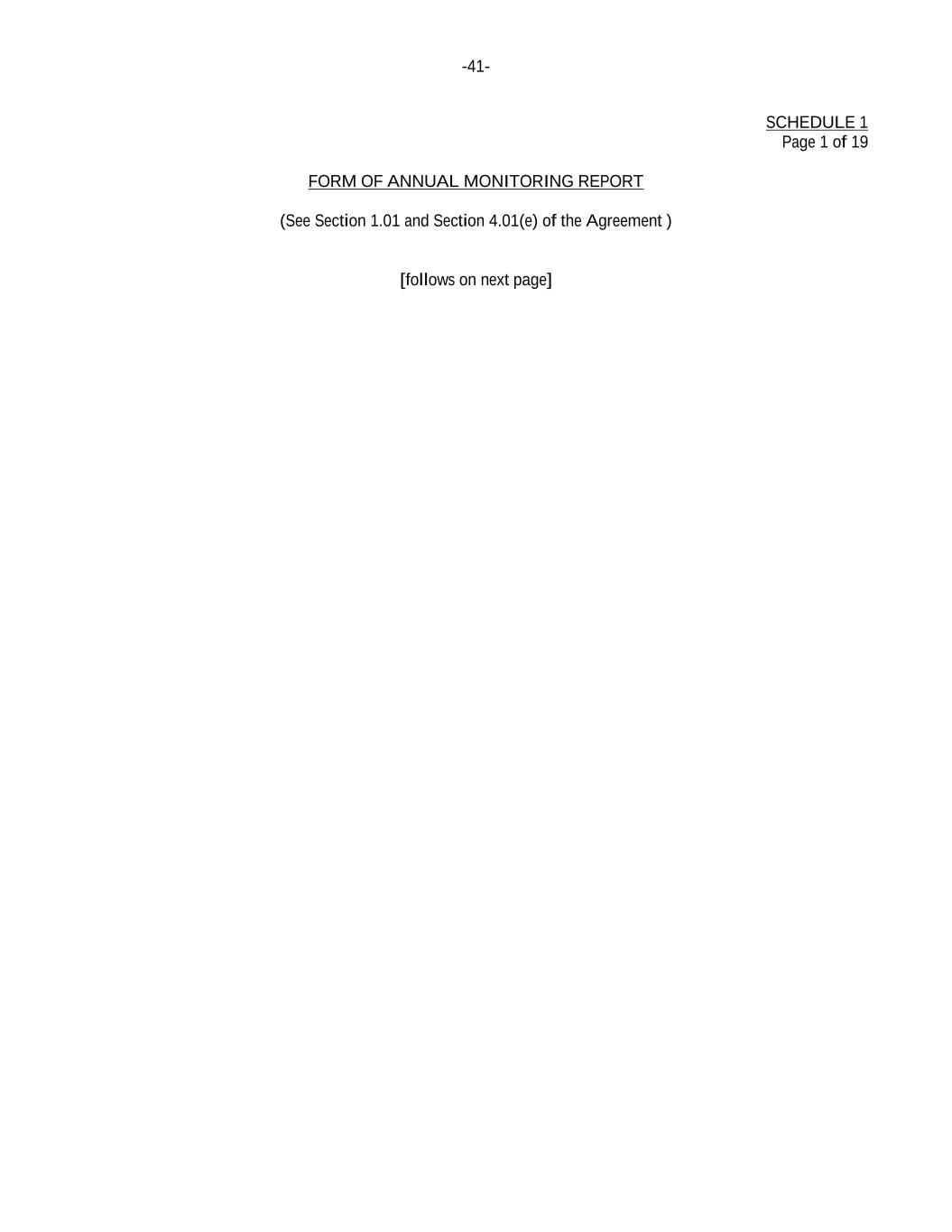 -41- SCHEDULE 1 Page 1 of 19 FORM OF ANNUAL MONITORING REPORT (See Section 1.01 and Section 4.01(e) of the Agreement ) [follows on next page]