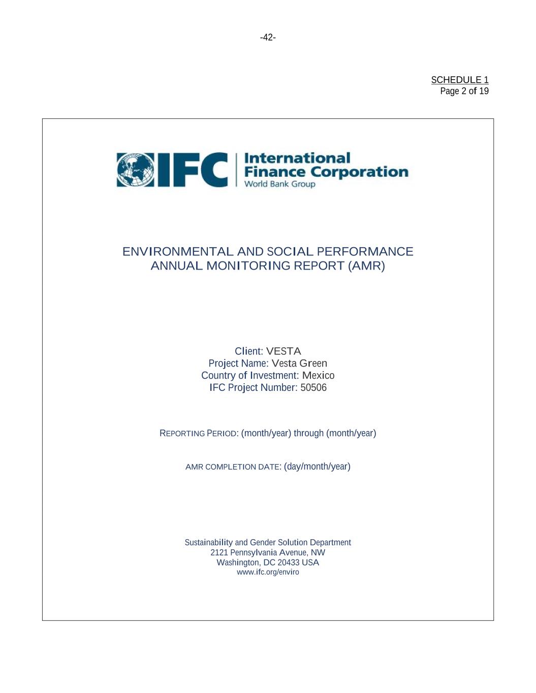 -42- SCHEDULE 1 Page 2 of 19 ENVIRONMENTAL AND SOCIAL PERFORMANCE ANNUAL MONITORING REPORT (AMR) Client: VESTA Project Name: Vesta Green Country of Investment: Mexico IFC Project Number: 50506 REPORTING PERIOD: (month/year) through (month/year) AMR COMPLETION DATE: (day/month/year) Sustainability and Gender Solution Department 2121 Pennsylvania Avenue, NW Washington, DC 20433 USA www.ifc.org/enviro