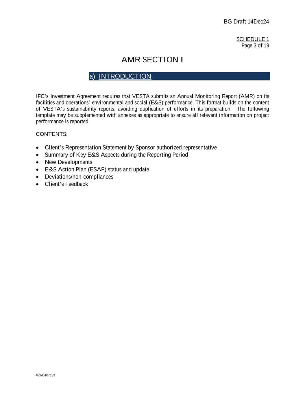BG Draft 14Dec24 #99451071v3 SCHEDULE 1 Page 3 of 19 AMR SECTION I a) INTRODUCTION IFC’s Investment Agreement requires that VESTA submits an Annual Monitoring Report (AMR) on its facilities and operations’ environmental and social (E&S) performance. This format builds on the content of VESTA’s sustainability reports, avoiding duplication of efforts in its preparation. The following template may be supplemented with annexes as appropriate to ensure all relevant information on project performance is reported. CONTENTS: • Client’s Representation Statement by Sponsor authorized representative • Summary of Key E&S Aspects during the Reporting Period • New Developments • E&S Action Plan (ESAP) status and update • Deviations/non-compliances • Client’s Feedback