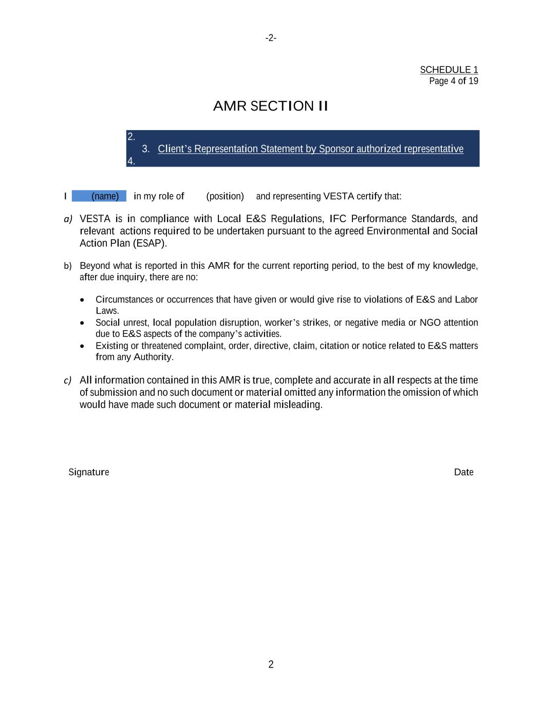 -2- 2 SCHEDULE 1 Page 4 of 19 AMR SECTION II 2. 3. Client’s Representation Statement by Sponsor authorized representative 4. I (name) in my role of (position) and representing VESTA certify that: a) VESTA is in compliance with Local E&S Regulations, IFC Performance Standards, and relevant actions required to be undertaken pursuant to the agreed Environmental and Social Action Plan (ESAP). b) Beyond what is reported in this AMR for the current reporting period, to the best of my knowledge, after due inquiry, there are no: • Circumstances or occurrences that have given or would give rise to violations of E&S and Labor Laws. • Social unrest, local population disruption, worker’s strikes, or negative media or NGO attention due to E&S aspects of the company’s activities. • Existing or threatened complaint, order, directive, claim, citation or notice related to E&S matters from any Authority. c) All information contained in this AMR is true, complete and accurate in all respects at the time of submission and no such document or material omitted any information the omission of which would have made such document or material misleading. Signature Date