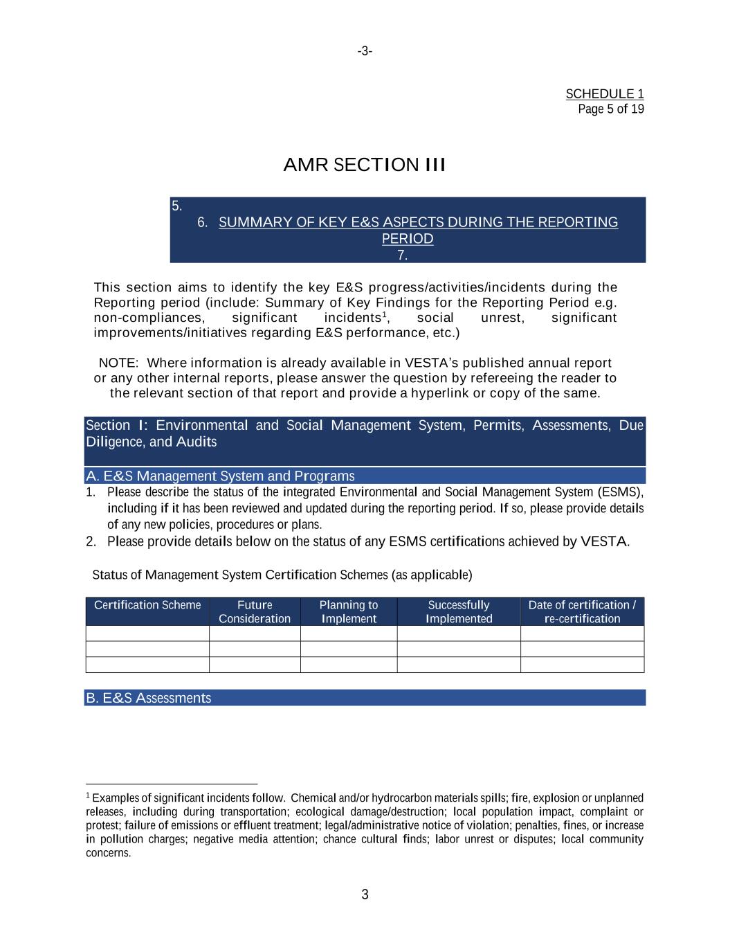 -3- 3 SCHEDULE 1 Page 5 of 19 AMR SECTION III 5. 6. SUMMARY OF KEY E&S ASPECTS DURING THE REPORTING PERIOD 7. This section aims to identify the key E&S progress/activities/incidents during the Reporting period (include: Summary of Key Findings for the Reporting Period e.g. non-compliances, significant incidents1, social unrest, significant improvements/initiatives regarding E&S performance, etc.) NOTE: Where information is already available in VESTA’s published annual report or any other internal reports, please answer the question by refereeing the reader to the relevant section of that report and provide a hyperlink or copy of the same. Section I: Environmental and Social Management System, Permits, Assessments, Due Diligence, and Audits A. E&S Management System and Programs 1. Please describe the status of the integrated Environmental and Social Management System (ESMS), including if it has been reviewed and updated during the reporting period. If so, please provide details of any new policies, procedures or plans. 2. Please provide details below on the status of any ESMS certifications achieved by VESTA. Status of Management System Certification Schemes (as applicable) Certification Scheme Future Consideration Planning to Implement Successfully Implemented Date of certification / re-certification B. E&S Assessments 1 Examples of significant incidents follow. Chemical and/or hydrocarbon materials spills; fire, explosion or unplanned releases, including during transportation; ecological damage/destruction; local population impact, complaint or protest; failure of emissions or effluent treatment; legal/administrative notice of violation; penalties, fines, or increase in pollution charges; negative media attention; chance cultural finds; labor unrest or disputes; local community concerns.