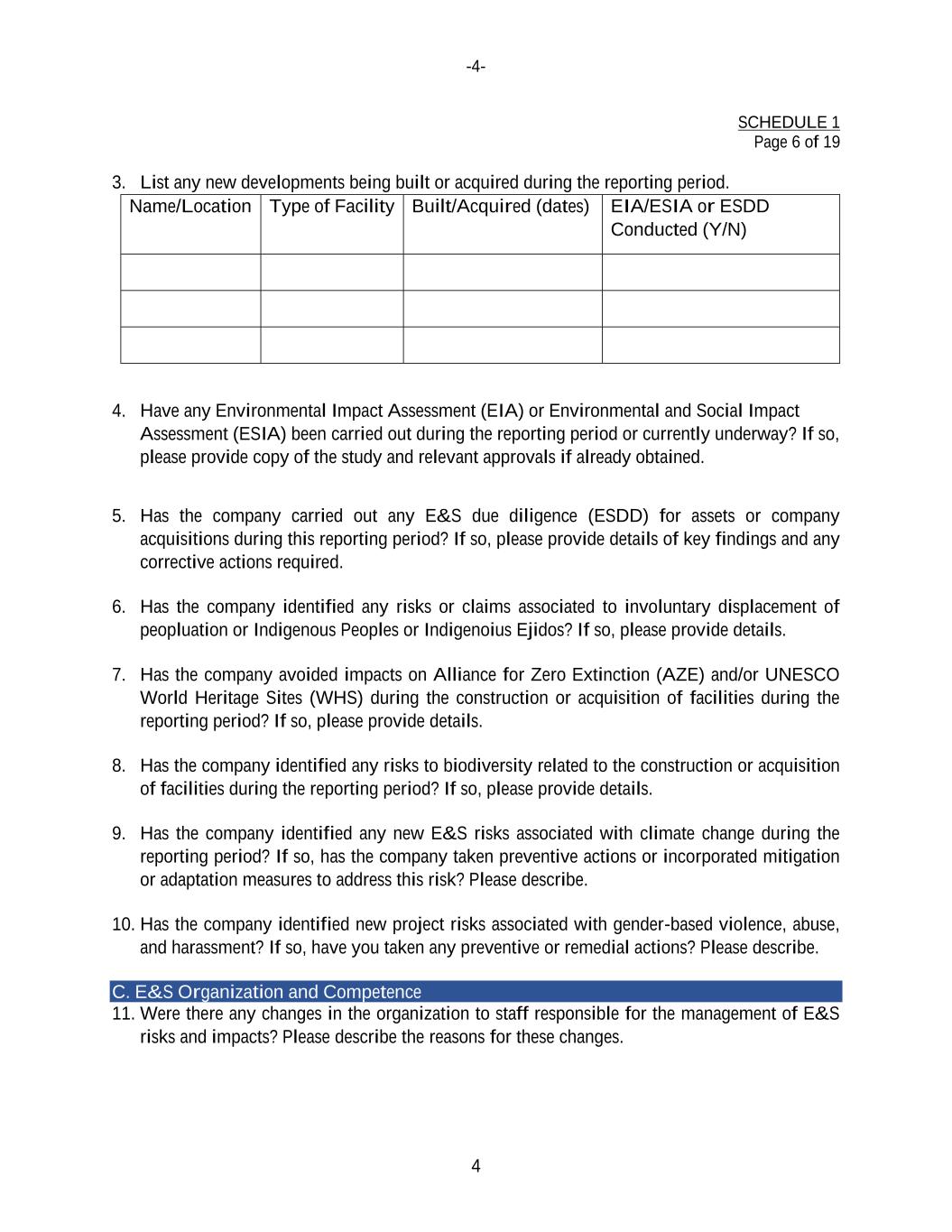 -4- 4 SCHEDULE 1 Page 6 of 19 3. List any new developments being built or acquired during the reporting period. Name/Location Type of Facility Built/Acquired (dates) EIA/ESIA or ESDD Conducted (Y/N) 4. Have any Environmental Impact Assessment (EIA) or Environmental and Social Impact Assessment (ESIA) been carried out during the reporting period or currently underway? If so, please provide copy of the study and relevant approvals if already obtained. 5. Has the company carried out any E&S due diligence (ESDD) for assets or company acquisitions during this reporting period? If so, please provide details of key findings and any corrective actions required. 6. Has the company identified any risks or claims associated to involuntary displacement of peopluation or Indigenous Peoples or Indigenoius Ejidos? If so, please provide details. 7. Has the company avoided impacts on Alliance for Zero Extinction (AZE) and/or UNESCO World Heritage Sites (WHS) during the construction or acquisition of facilities during the reporting period? If so, please provide details. 8. Has the company identified any risks to biodiversity related to the construction or acquisition of facilities during the reporting period? If so, please provide details. 9. Has the company identified any new E&S risks associated with climate change during the reporting period? If so, has the company taken preventive actions or incorporated mitigation or adaptation measures to address this risk? Please describe. 10. Has the company identified new project risks associated with gender-based violence, abuse, and harassment? If so, have you taken any preventive or remedial actions? Please describe. C. E&S Organization and Competence 11. Were there any changes in the organization to staff responsible for the management of E&S risks and impacts? Please describe the reasons for these changes.