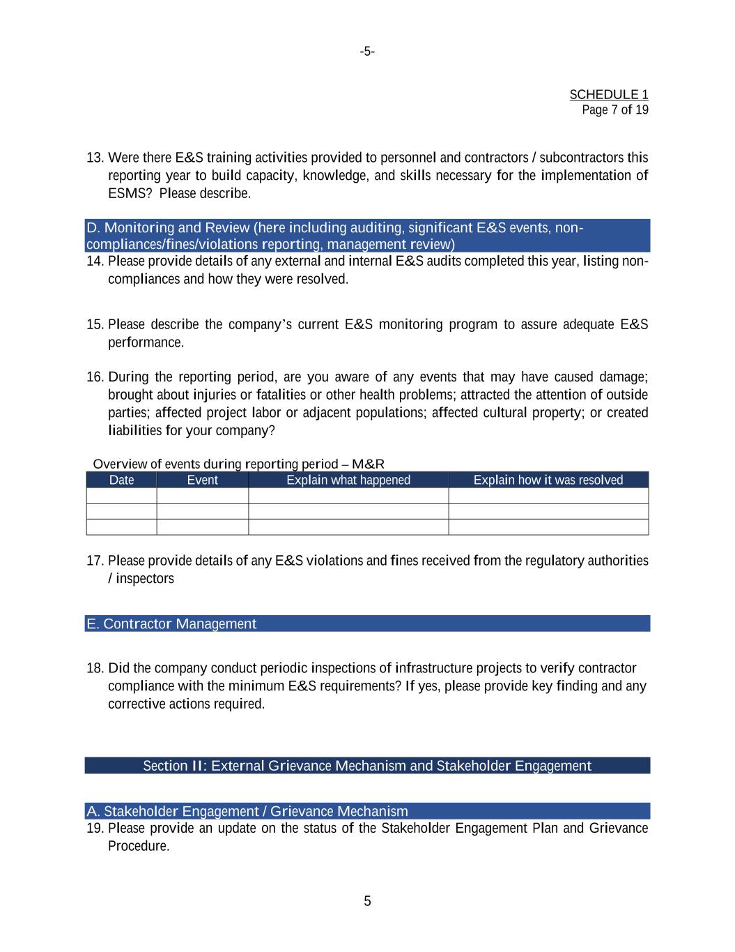 -5- 5 SCHEDULE 1 Page 7 of 19 13. Were there E&S training activities provided to personnel and contractors / subcontractors this reporting year to build capacity, knowledge, and skills necessary for the implementation of ESMS? Please describe. D. Monitoring and Review (here including auditing, significant E&S events, non- compliances/fines/violations reporting, management review) 14. Please provide details of any external and internal E&S audits completed this year, listing non- compliances and how they were resolved. 15. Please describe the company’s current E&S monitoring program to assure adequate E&S performance. 16. During the reporting period, are you aware of any events that may have caused damage; brought about injuries or fatalities or other health problems; attracted the attention of outside parties; affected project labor or adjacent populations; affected cultural property; or created liabilities for your company? Overview of events during reporting period – M&R Date Event Explain what happened Explain how it was resolved 17. Please provide details of any E&S violations and fines received from the regulatory authorities / inspectors E. Contractor Management 18. Did the company conduct periodic inspections of infrastructure projects to verify contractor compliance with the minimum E&S requirements? If yes, please provide key finding and any corrective actions required. Section II: External Grievance Mechanism and Stakeholder Engagement A. Stakeholder Engagement / Grievance Mechanism 19. Please provide an update on the status of the Stakeholder Engagement Plan and Grievance Procedure.