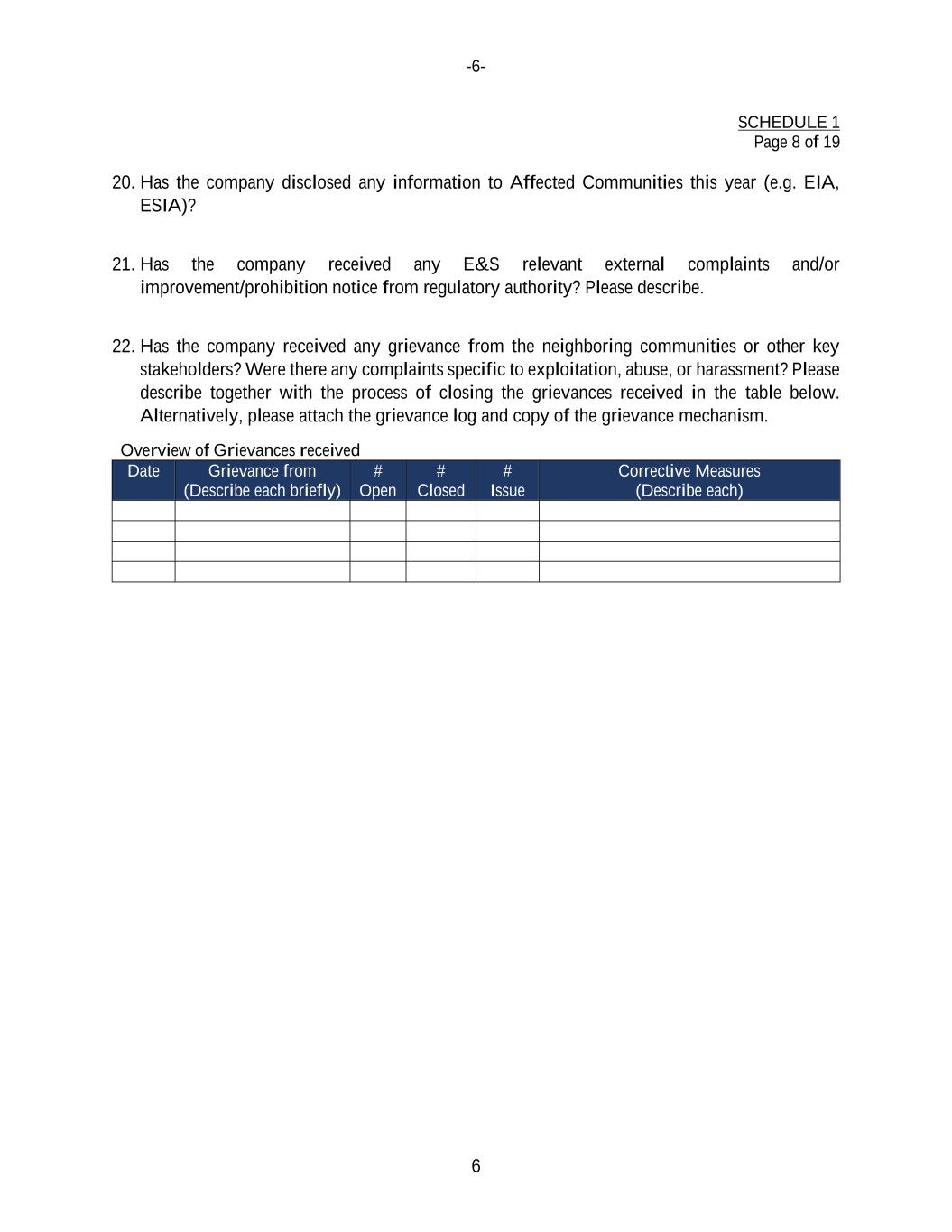 -6- 6 SCHEDULE 1 Page 8 of 19 20. Has the company disclosed any information to Affected Communities this year (e.g. EIA, ESIA)? 21. Has the company received any E&S relevant external complaints and/or improvement/prohibition notice from regulatory authority? Please describe. 22. Has the company received any grievance from the neighboring communities or other key stakeholders? Were there any complaints specific to exploitation, abuse, or harassment? Please describe together with the process of closing the grievances received in the table below. Alternatively, please attach the grievance log and copy of the grievance mechanism. Overview of Grievances received Date Grievance from (Describe each briefly) # Open # Closed # Issue Corrective Measures (Describe each)