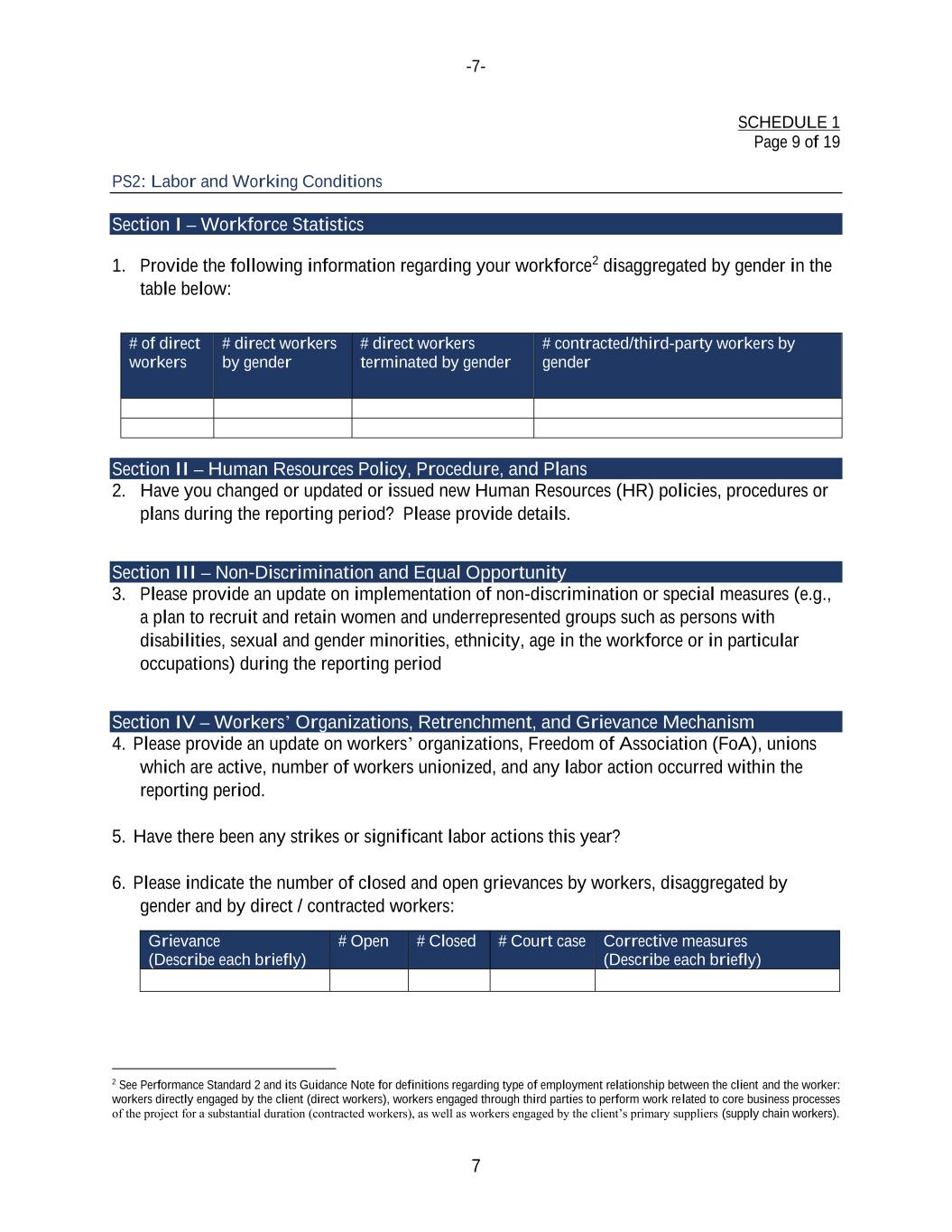 -7- 7 SCHEDULE 1 Page 9 of 19 PS2: Labor and Working Conditions Section I – Workforce Statistics 1. Provide the following information regarding your workforce2 disaggregated by gender in the table below: # of direct workers # direct workers by gender # direct workers terminated by gender # contracted/third-party workers by gender Section II – Human Resources Policy, Procedure, and Plans 2. Have you changed or updated or issued new Human Resources (HR) policies, procedures or plans during the reporting period? Please provide details. Section III – Non-Discrimination and Equal Opportunity 3. Please provide an update on implementation of non-discrimination or special measures (e.g., a plan to recruit and retain women and underrepresented groups such as persons with disabilities, sexual and gender minorities, ethnicity, age in the workforce or in particular occupations) during the reporting period Section IV – Workers’ Organizations, Retrenchment, and Grievance Mechanism 4. Please provide an update on workers’ organizations, Freedom of Association (FoA), unions which are active, number of workers unionized, and any labor action occurred within the reporting period. 5. Have there been any strikes or significant labor actions this year? 6. Please indicate the number of closed and open grievances by workers, disaggregated by gender and by direct / contracted workers: Grievance (Describe each briefly) # Open # Closed # Court case Corrective measures (Describe each briefly) 2 See Performance Standard 2 and its Guidance Note for definitions regarding type of employment relationship between the client and the worker: workers directly engaged by the client (direct workers), workers engaged through third parties to perform work related to core business processes of the project for a substantial duration (contracted workers), as well as workers engaged by the client’s primary suppliers (supply chain workers).