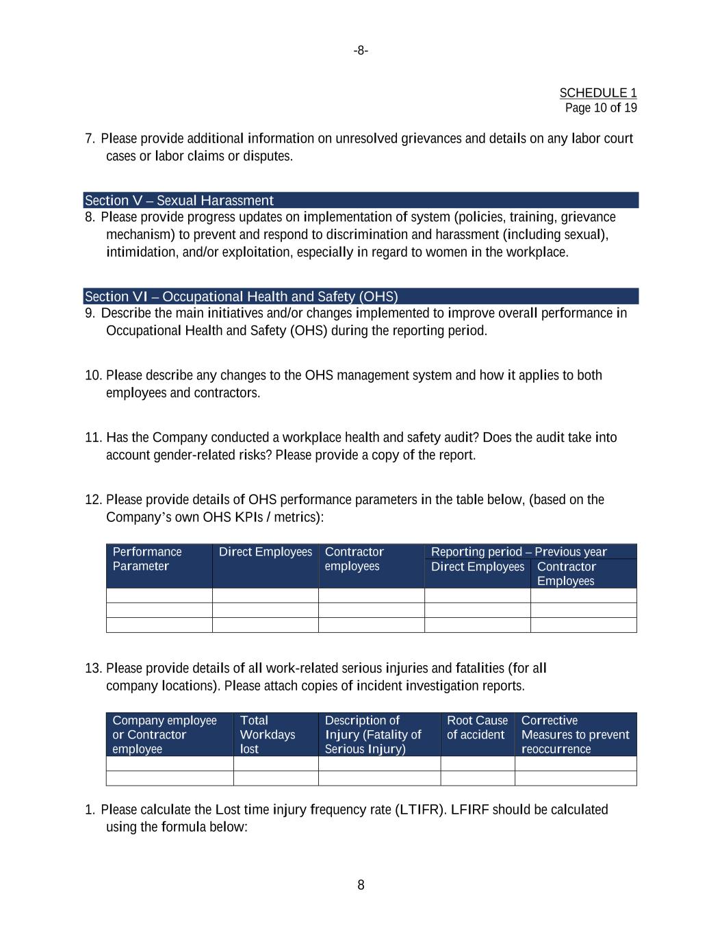 -8- 8 SCHEDULE 1 Page 10 of 19 7. Please provide additional information on unresolved grievances and details on any labor court cases or labor claims or disputes. Section V – Sexual Harassment 8. Please provide progress updates on implementation of system (policies, training, grievance mechanism) to prevent and respond to discrimination and harassment (including sexual), intimidation, and/or exploitation, especially in regard to women in the workplace. Section VI – Occupational Health and Safety (OHS) 9. Describe the main initiatives and/or changes implemented to improve overall performance in Occupational Health and Safety (OHS) during the reporting period. 10. Please describe any changes to the OHS management system and how it applies to both employees and contractors. 11. Has the Company conducted a workplace health and safety audit? Does the audit take into account gender-related risks? Please provide a copy of the report. 12. Please provide details of OHS performance parameters in the table below, (based on the Company’s own OHS KPIs / metrics): Performance Parameter Direct Employees Contractor employees Reporting period – Previous year Direct Employees Contractor Employees 13. Please provide details of all work-related serious injuries and fatalities (for all company locations). Please attach copies of incident investigation reports. Company employee or Contractor employee Total Workdays lost Description of Injury (Fatality of Serious Injury) Root Cause of accident Corrective Measures to prevent reoccurrence 1. Please calculate the Lost time injury frequency rate (LTIFR). LFIRF should be calculated using the formula below: