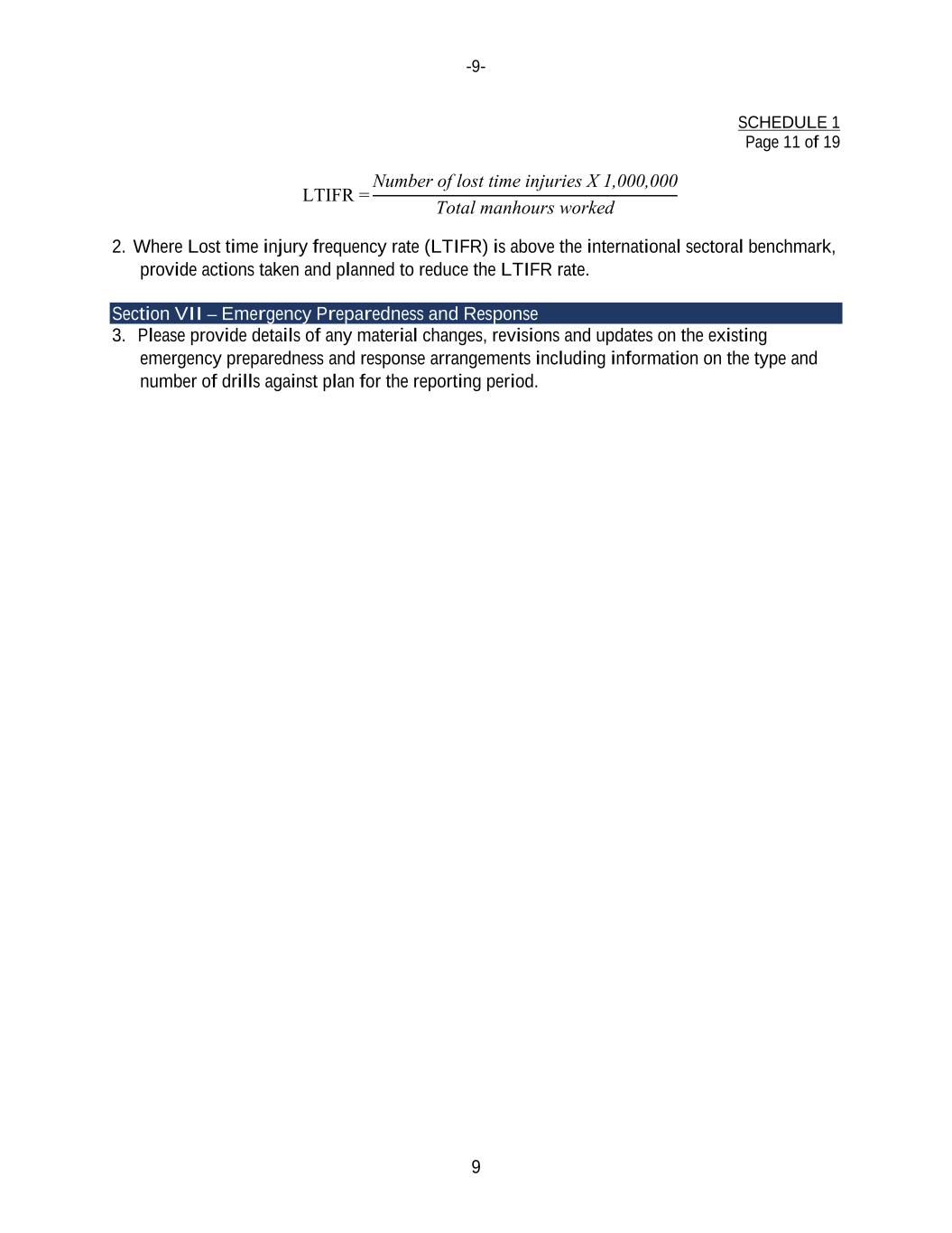 -9- 9 SCHEDULE 1 Page 11 of 19 LTIFR = Number of lost time injuries X 1,000,000 Total manhours worked 2. Where Lost time injury frequency rate (LTIFR) is above the international sectoral benchmark, provide actions taken and planned to reduce the LTIFR rate. Section VII – Emergency Preparedness and Response 3. Please provide details of any material changes, revisions and updates on the existing emergency preparedness and response arrangements including information on the type and number of drills against plan for the reporting period.