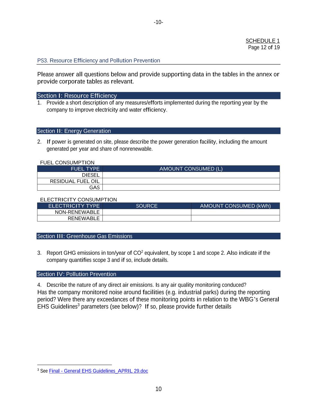 -10- 10 SCHEDULE 1 Page 12 of 19 PS3. Resource Efficiency and Pollution Prevention Please answer all questions below and provide supporting data in the tables in the annex or provide corporate tables as relevant. Section I: Resource Efficiency 1. Provide a short description of any measures/efforts implemented during the reporting year by the company to improve electricity and water efficiency. Section II: Energy Generation 2. If power is generated on site, please describe the power generation facility, including the amount generated per year and share of nonrenewable. FUEL CONSUMPTION FUEL TYPE AMOUNT CONSUMED (L) DIESEL RESIDUAL FUEL OIL GAS ELECTRICITY CONSUMPTION ELECTRICITY TYPE SOURCE AMOUNT CONSUMED (kWh) NON-RENEWABLE RENEWABLE Section III: Greenhouse Gas Emissions 3. Report GHG emissions in ton/year of CO2 equivalent, by scope 1 and scope 2. Also indicate if the company quantifies scope 3 and if so, include details. Section IV: Pollution Prevention 4. Describe the nature of any direct air emissions. Is any air quality monitoring conduced? Has the company monitored noise around facilities (e.g. industrial parks) during the reporting period? Were there any exceedances of these monitoring points in relation to the WBG’s General EHS Guidelines3 parameters (see below)? If so, please provide further details 3 See Final - General EHS Guidelines_APRIL 29.doc