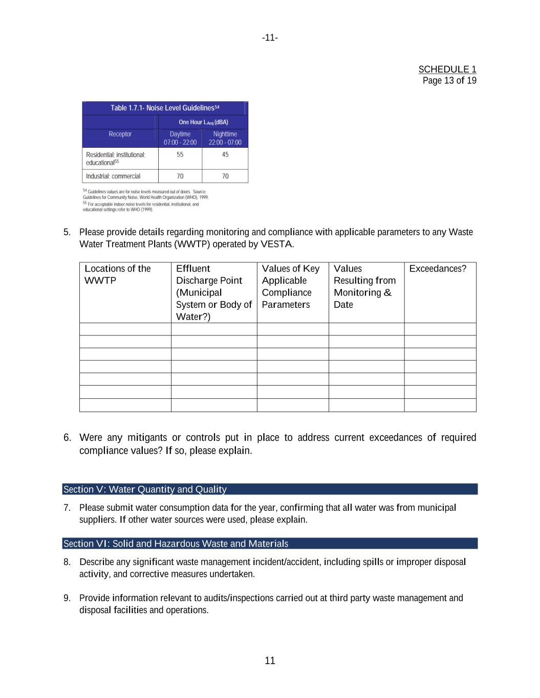 -11- 11 SCHEDULE 1 Page 13 of 19 5. Please provide details regarding monitoring and compliance with applicable parameters to any Waste Water Treatment Plants (WWTP) operated by VESTA. Locations of the WWTP Effluent Discharge Point (Municipal System or Body of Water?) Values of Key Applicable Compliance Parameters Values Resulting from Monitoring & Date Exceedances? 6. Were any mitigants or controls put in place to address current exceedances of required compliance values? If so, please explain. Section V: Water Quantity and Quality 7. Please submit water consumption data for the year, confirming that all water was from municipal suppliers. If other water sources were used, please explain. Section VI: Solid and Hazardous Waste and Materials 8. Describe any significant waste management incident/accident, including spills or improper disposal activity, and corrective measures undertaken. 9. Provide information relevant to audits/inspections carried out at third party waste management and disposal facilities and operations.