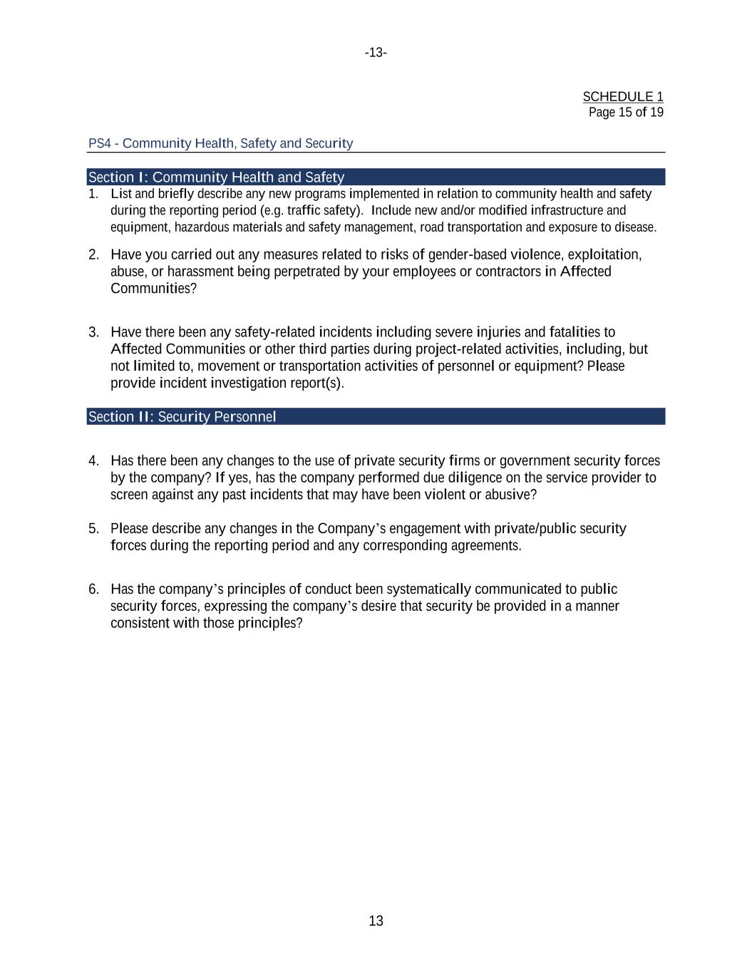 -13- 13 SCHEDULE 1 Page 15 of 19 PS4 - Community Health, Safety and Security Section I: Community Health and Safety 1. List and briefly describe any new programs implemented in relation to community health and safety during the reporting period (e.g. traffic safety). Include new and/or modified infrastructure and equipment, hazardous materials and safety management, road transportation and exposure to disease. 2. Have you carried out any measures related to risks of gender-based violence, exploitation, abuse, or harassment being perpetrated by your employees or contractors in Affected Communities? 3. Have there been any safety-related incidents including severe injuries and fatalities to Affected Communities or other third parties during project-related activities, including, but not limited to, movement or transportation activities of personnel or equipment? Please provide incident investigation report(s). Section II: Security Personnel 4. Has there been any changes to the use of private security firms or government security forces by the company? If yes, has the company performed due diligence on the service provider to screen against any past incidents that may have been violent or abusive? 5. Please describe any changes in the Company’s engagement with private/public security forces during the reporting period and any corresponding agreements. 6. Has the company’s principles of conduct been systematically communicated to public security forces, expressing the company’s desire that security be provided in a manner consistent with those principles?
