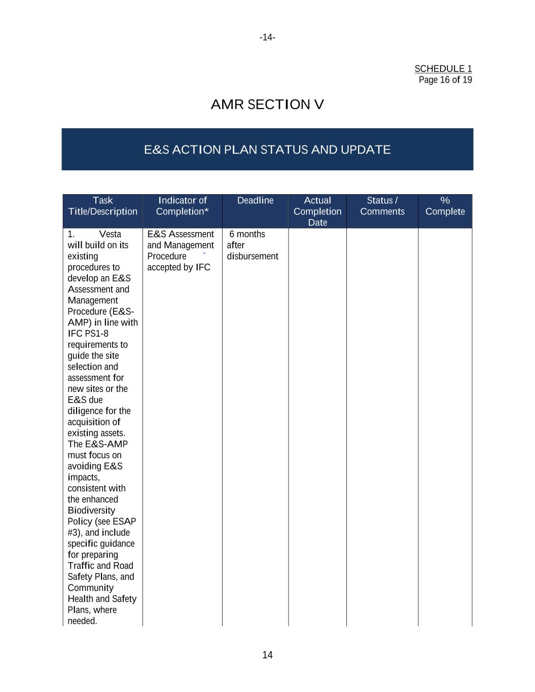 -14- 14 SCHEDULE 1 Page 16 of 19 AMR SECTION V E&S ACTION PLAN STATUS AND UPDATE Task Title/Description Indicator of Completion* Deadline Actual Completion Date Status / Comments % Complete 1. Vesta will build on its existing procedures to develop an E&S Assessment and Management Procedure (E&S- AMP) in line with IFC PS1-8 requirements to guide the site selection and assessment for new sites or the E&S due diligence for the acquisition of existing assets. The E&S-AMP must focus on avoiding E&S impacts, consistent with the enhanced Biodiversity Policy (see ESAP #3), and include specific guidance for preparing Traffic and Road Safety Plans, and Community Health and Safety Plans, where needed. E&S Assessment and Management Procedure accepted by IFC 6 months after disbursement