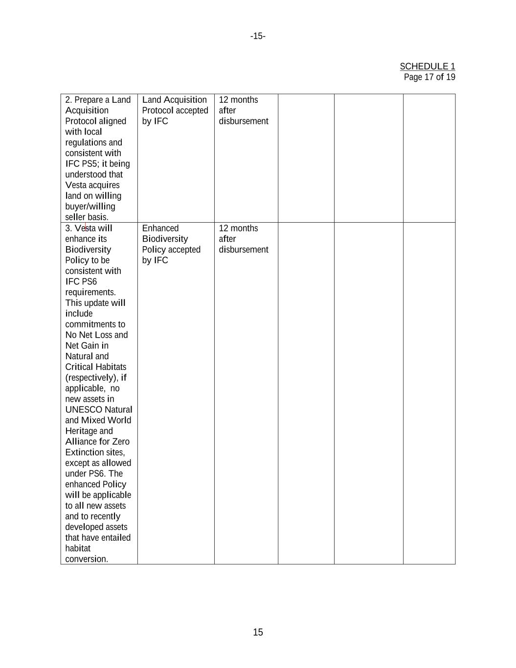 -15- 15 SCHEDULE 1 Page 17 of 19 2. Prepare a Land Acquisition Protocol aligned with local regulations and consistent with IFC PS5; it being understood that Vesta acquires land on willing buyer/willing seller basis. Land Acquisition Protocol accepted by IFC 12 months after disbursement 3. Vesta will enhance its Biodiversity Policy to be consistent with IFC PS6 requirements. This update will include commitments to No Net Loss and Net Gain in Natural and Critical Habitats (respectively), if applicable, no new assets in UNESCO Natural and Mixed World Heritage and Alliance for Zero Extinction sites, except as allowed under PS6. The enhanced Policy will be applicable to all new assets and to recently developed assets that have entailed habitat conversion. Enhanced Biodiversity Policy accepted by IFC 12 months after disbursement