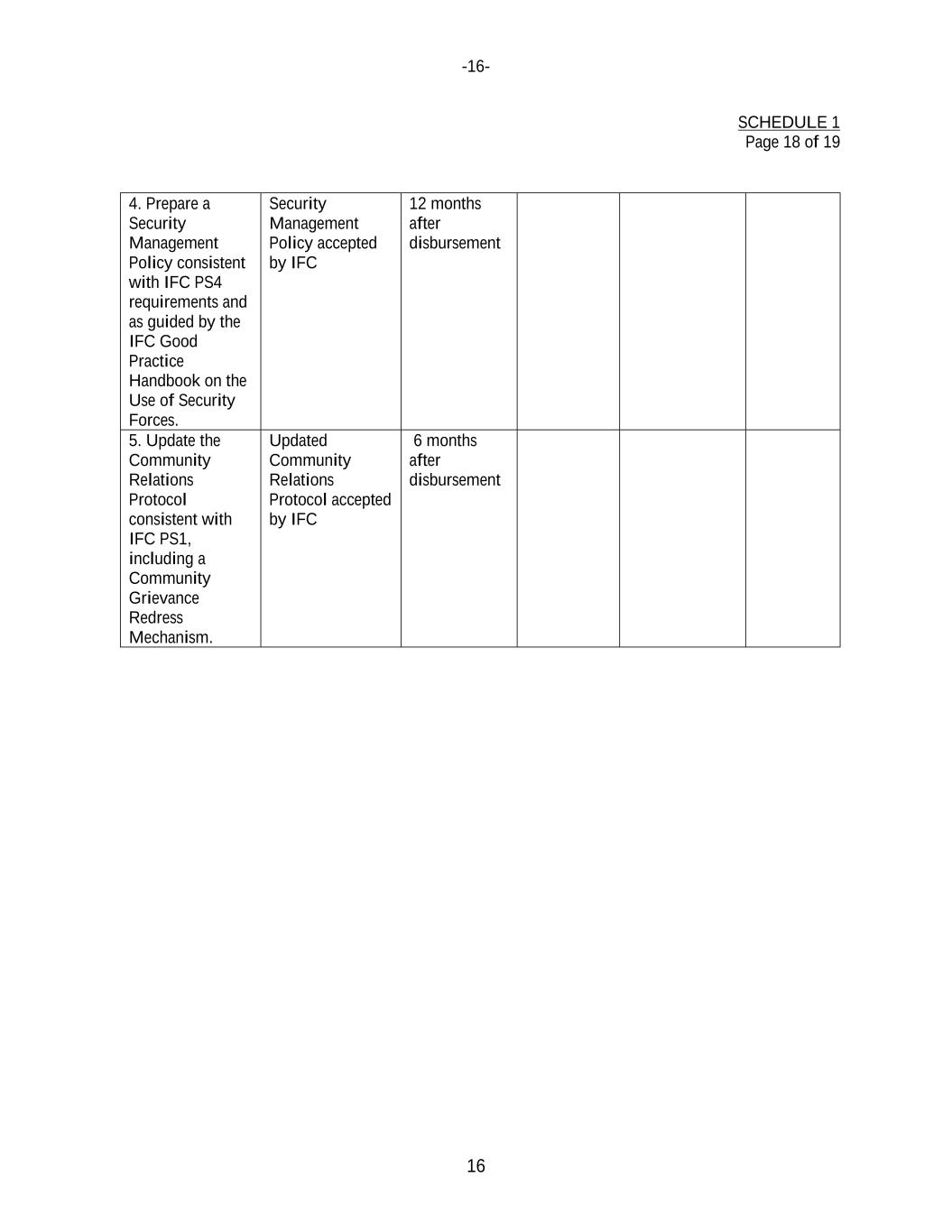 -16- 16 SCHEDULE 1 Page 18 of 19 4. Prepare a Security Management Policy consistent with IFC PS4 requirements and as guided by the IFC Good Practice Handbook on the Use of Security Forces. Security Management Policy accepted by IFC 12 months after disbursement 5. Update the Community Relations Protocol consistent with IFC PS1, including a Community Grievance Redress Mechanism. Updated Community Relations Protocol accepted by IFC 6 months after disbursement