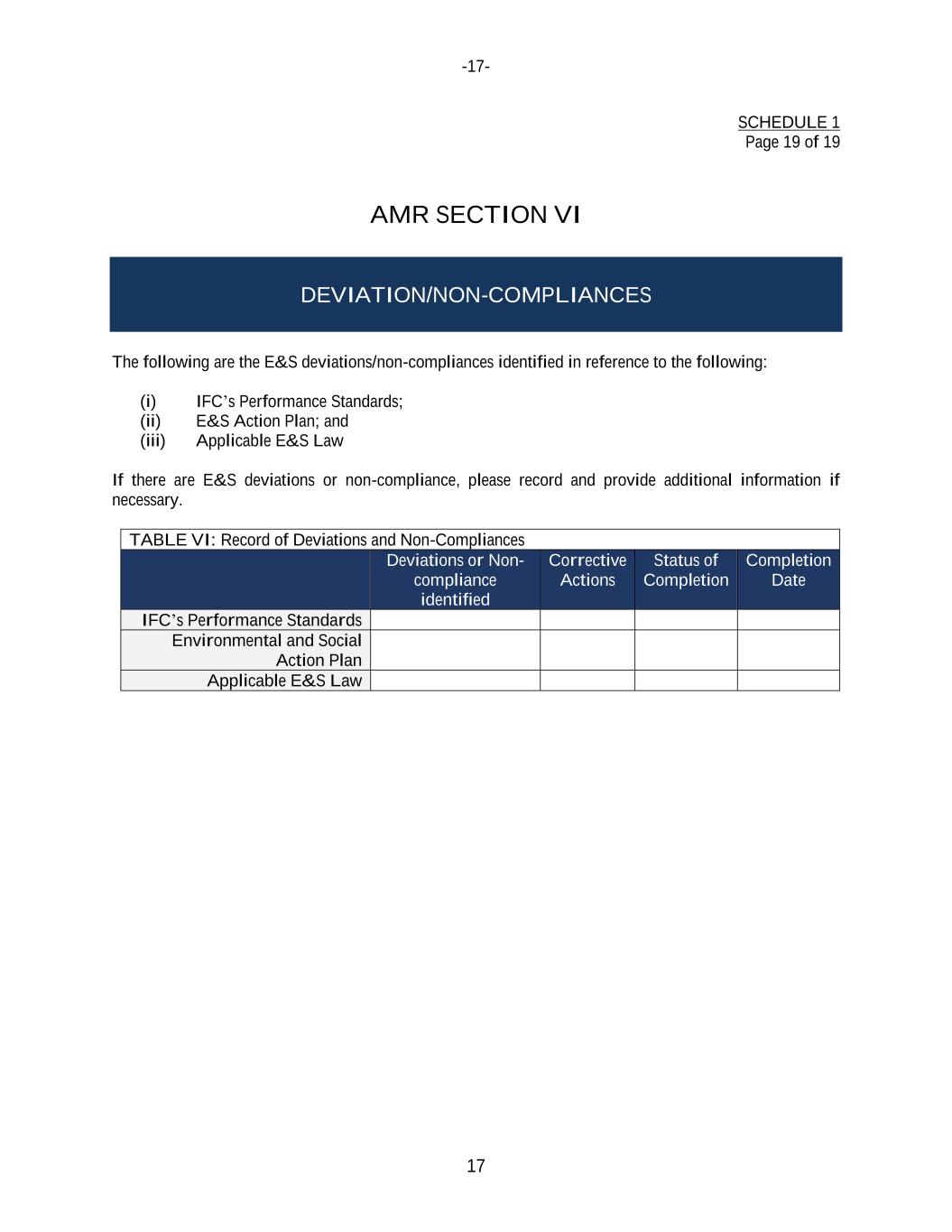-17- 17 SCHEDULE 1 Page 19 of 19 AMR SECTION VI DEVIATION/NON-COMPLIANCES The following are the E&S deviations/non-compliances identified in reference to the following: (i) IFC’s Performance Standards; (ii) E&S Action Plan; and (iii) Applicable E&S Law If there are E&S deviations or non-compliance, please record and provide additional information if necessary. TABLE VI: Record of Deviations and Non-Compliances Deviations or Non- compliance identified Corrective Actions Status of Completion Completion Date IFC’s Performance Standards Environmental and Social Action Plan Applicable E&S Law
