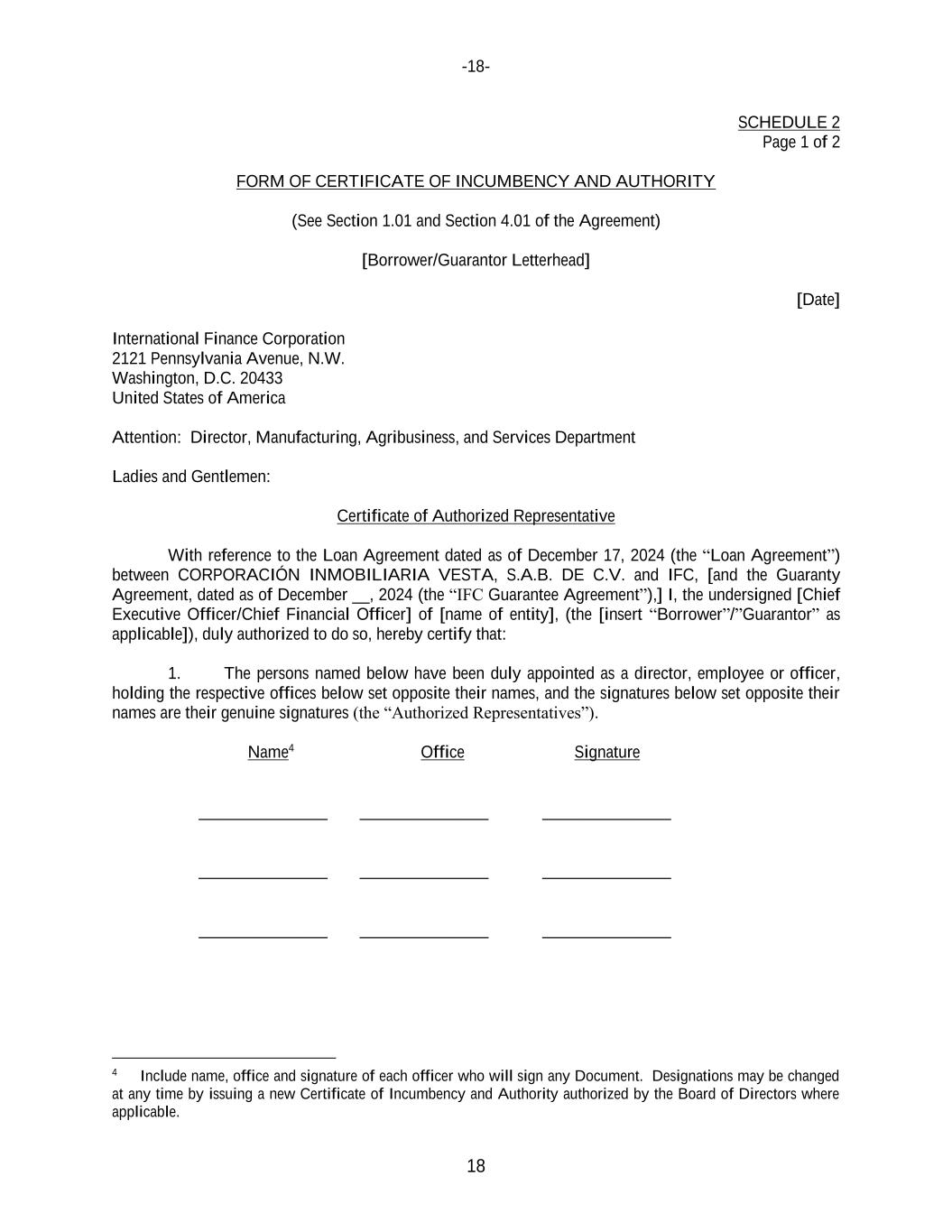 -18- 18 SCHEDULE 2 Page 1 of 2 FORM OF CERTIFICATE OF INCUMBENCY AND AUTHORITY (See Section 1.01 and Section 4.01 of the Agreement) [Borrower/Guarantor Letterhead] [Date] International Finance Corporation 2121 Pennsylvania Avenue, N.W. Washington, D.C. 20433 United States of America Attention: Director, Manufacturing, Agribusiness, and Services Department Ladies and Gentlemen: Certificate of Authorized Representative With reference to the Loan Agreement dated as of December 17, 2024 (the “Loan Agreement”) between CORPORACIÓN INMOBILIARIA VESTA, S.A.B. DE C.V. and IFC, [and the Guaranty Agreement, dated as of December __, 2024 (the “IFC Guarantee Agreement”),] I, the undersigned [Chief Executive Officer/Chief Financial Officer] of [name of entity], (the [insert “Borrower”/”Guarantor” as applicable]), duly authorized to do so, hereby certify that: 1. The persons named below have been duly appointed as a director, employee or officer, holding the respective offices below set opposite their names, and the signatures below set opposite their names are their genuine signatures (the “Authorized Representatives”). Name4 Office Signature _______________ _______________ _______________ _______________ _______________ _______________ _______________ _______________ _______________ 4 Include name, office and signature of each officer who will sign any Document. Designations may be changed at any time by issuing a new Certificate of Incumbency and Authority authorized by the Board of Directors where applicable.