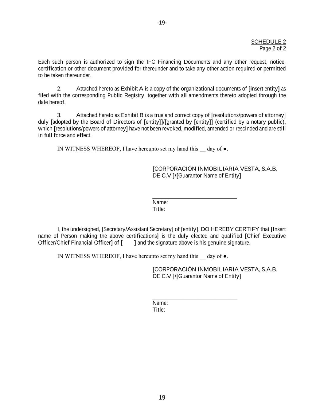 -19- 19 SCHEDULE 2 Page 2 of 2 Each such person is authorized to sign the IFC Financing Documents and any other request, notice, certification or other document provided for thereunder and to take any other action required or permitted to be taken thereunder. 2. Attached hereto as Exhibit A is a copy of the organizational documents of [insert entity] as filed with the corresponding Public Registry, together with all amendments thereto adopted through the date hereof. 3. Attached hereto as Exhibit B is a true and correct copy of [resolutions/powers of attorney] duly [adopted by the Board of Directors of [entity]]/[granted by [entity]] (certified by a notary public), which [resolutions/powers of attorney] have not been revoked, modified, amended or rescinded and are still in full force and effect. IN WITNESS WHEREOF, I have hereunto set my hand this __ day of ●. [CORPORACIÓN INMOBILIARIA VESTA, S.A.B. DE C.V.]/[Guarantor Name of Entity] _____________________________ Name: Title: I, the undersigned, [Secretary/Assistant Secretary] of [entity], DO HEREBY CERTIFY that [Insert name of Person making the above certifications] is the duly elected and qualified [Chief Executive Officer/Chief Financial Officer] of [ ] and the signature above is his genuine signature. IN WITNESS WHEREOF, I have hereunto set my hand this __ day of ●. [CORPORACIÓN INMOBILIARIA VESTA, S.A.B. DE C.V.]/[Guarantor Name of Entity] _____________________________ Name: Title: