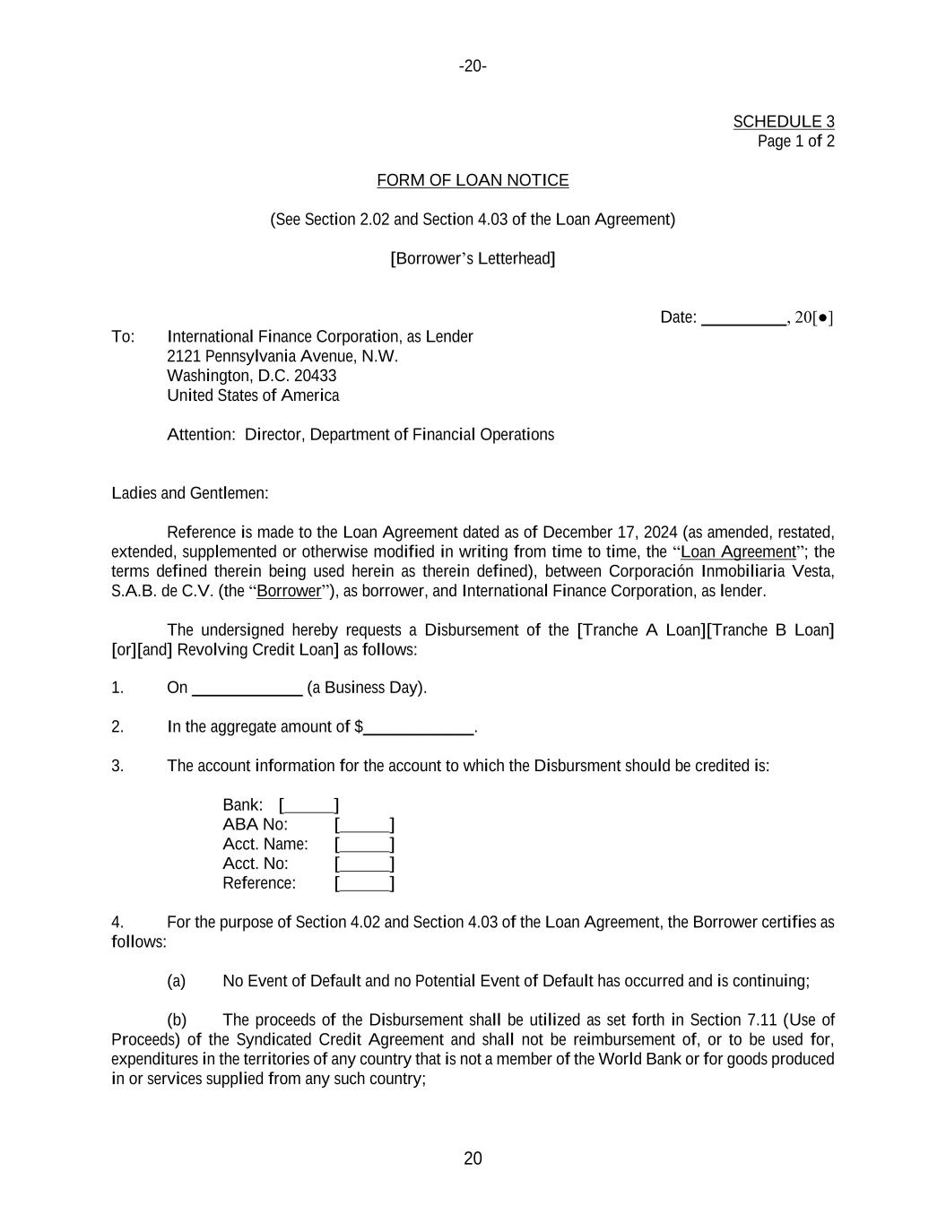 -20- 20 SCHEDULE 3 Page 1 of 2 FORM OF LOAN NOTICE (See Section 2.02 and Section 4.03 of the Loan Agreement) [Borrower’s Letterhead] Date: __________, 20[●] To: International Finance Corporation, as Lender 2121 Pennsylvania Avenue, N.W. Washington, D.C. 20433 United States of America Attention: Director, Department of Financial Operations Ladies and Gentlemen: Reference is made to the Loan Agreement dated as of December 17, 2024 (as amended, restated, extended, supplemented or otherwise modified in writing from time to time, the “Loan Agreement”; the terms defined therein being used herein as therein defined), between Corporación Inmobiliaria Vesta, S.A.B. de C.V. (the “Borrower”), as borrower, and International Finance Corporation, as lender. The undersigned hereby requests a Disbursement of the [Tranche A Loan][Tranche B Loan] [or][and] Revolving Credit Loan] as follows: 1. On _____________ (a Business Day). 2. In the aggregate amount of $_____________. 3. The account information for the account to which the Disbursment should be credited is: Bank: [ ] ABA No: [ ] Acct. Name: [ ] Acct. No: [ ] Reference: [ ] 4. For the purpose of Section 4.02 and Section 4.03 of the Loan Agreement, the Borrower certifies as follows: (a) No Event of Default and no Potential Event of Default has occurred and is continuing; (b) The proceeds of the Disbursement shall be utilized as set forth in Section 7.11 (Use of Proceeds) of the Syndicated Credit Agreement and shall not be reimbursement of, or to be used for, expenditures in the territories of any country that is not a member of the World Bank or for goods produced in or services supplied from any such country;