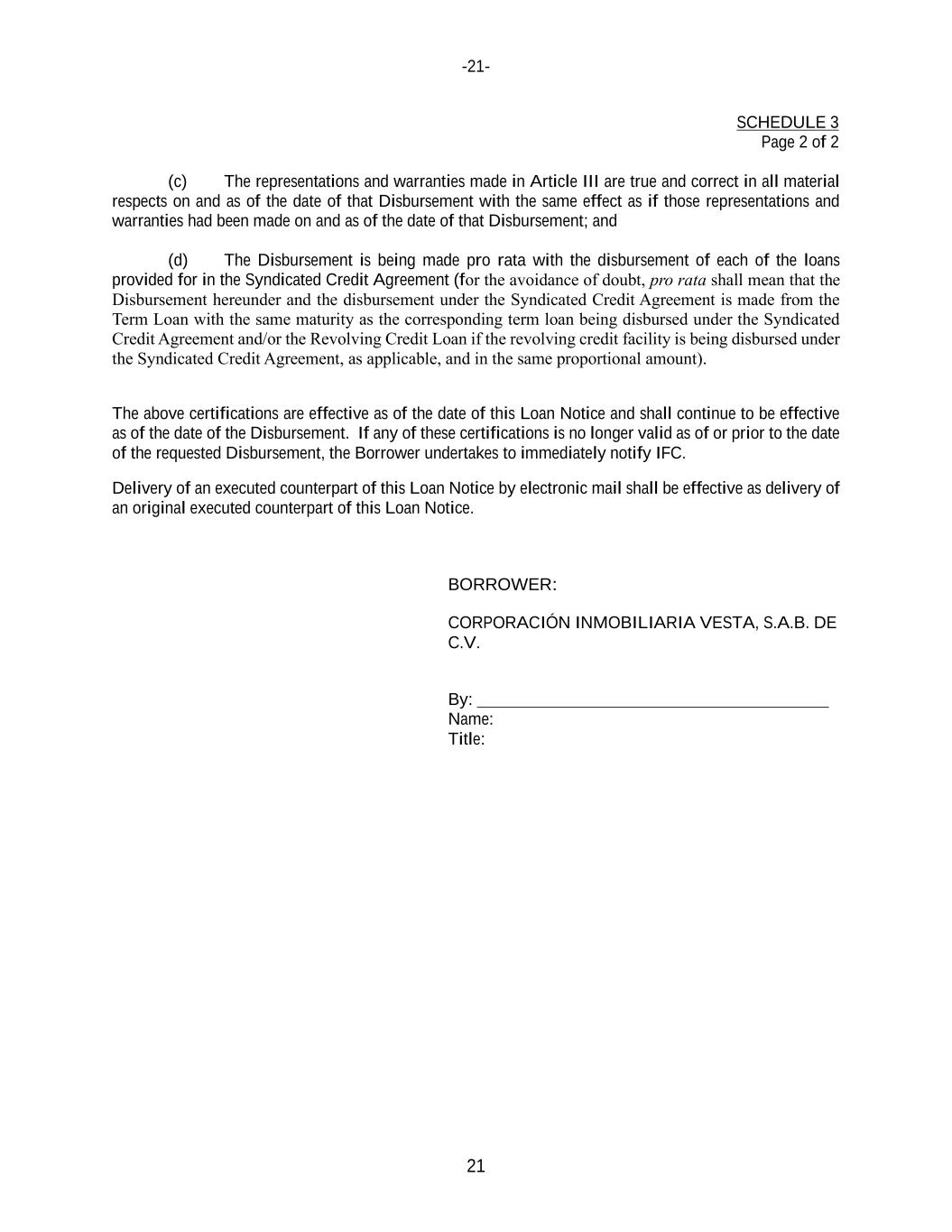 -21- 21 SCHEDULE 3 Page 2 of 2 (c) The representations and warranties made in Article III are true and correct in all material respects on and as of the date of that Disbursement with the same effect as if those representations and warranties had been made on and as of the date of that Disbursement; and (d) The Disbursement is being made pro rata with the disbursement of each of the loans provided for in the Syndicated Credit Agreement (for the avoidance of doubt, pro rata shall mean that the Disbursement hereunder and the disbursement under the Syndicated Credit Agreement is made from the Term Loan with the same maturity as the corresponding term loan being disbursed under the Syndicated Credit Agreement and/or the Revolving Credit Loan if the revolving credit facility is being disbursed under the Syndicated Credit Agreement, as applicable, and in the same proportional amount). The above certifications are effective as of the date of this Loan Notice and shall continue to be effective as of the date of the Disbursement. If any of these certifications is no longer valid as of or prior to the date of the requested Disbursement, the Borrower undertakes to immediately notify IFC. Delivery of an executed counterpart of this Loan Notice by electronic mail shall be effective as delivery of an original executed counterpart of this Loan Notice. BORROWER: CORPORACIÓN INMOBILIARIA VESTA, S.A.B. DE C.V. By: Name: Title: