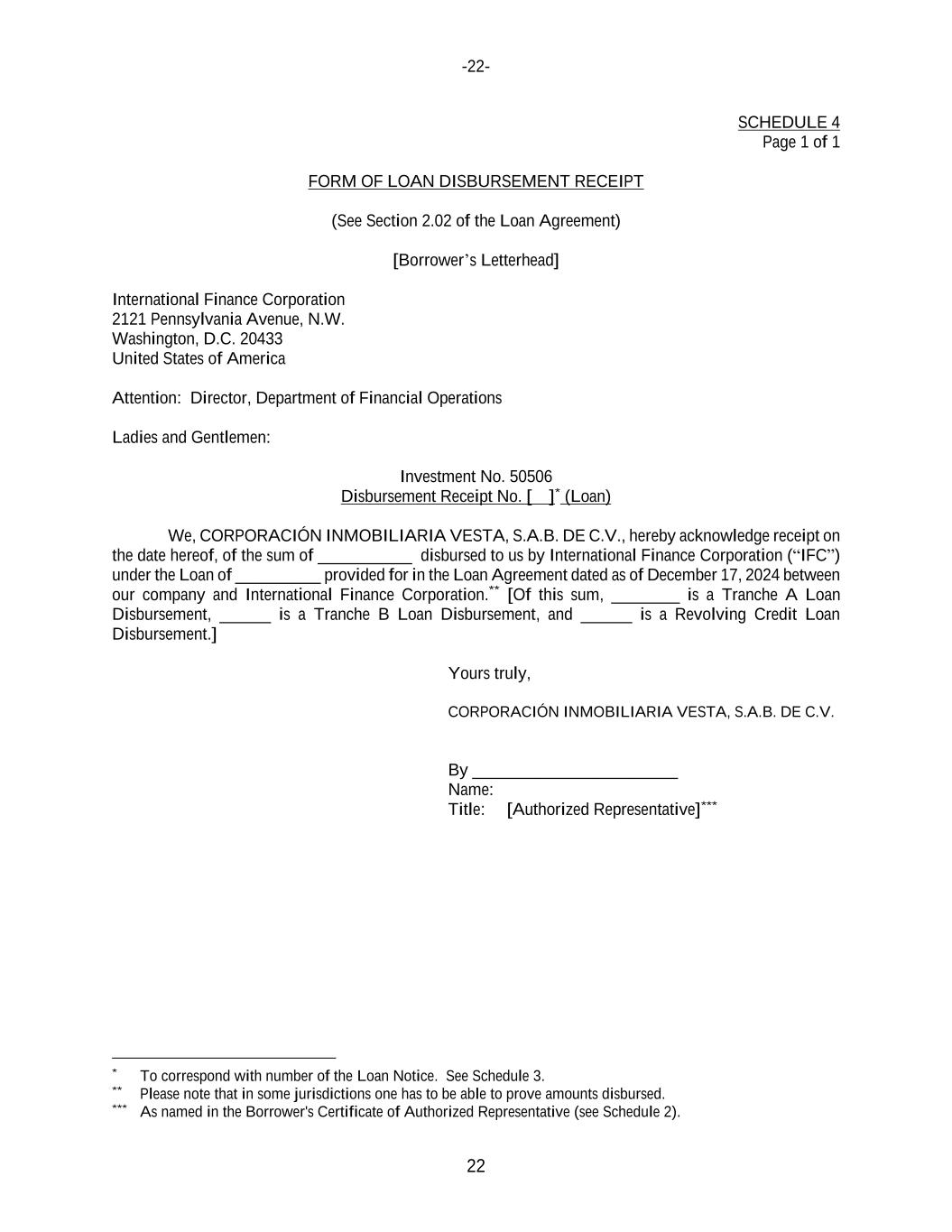 -22- 22 SCHEDULE 4 Page 1 of 1 FORM OF LOAN DISBURSEMENT RECEIPT (See Section 2.02 of the Loan Agreement) [Borrower’s Letterhead] International Finance Corporation 2121 Pennsylvania Avenue, N.W. Washington, D.C. 20433 United States of America Attention: Director, Department of Financial Operations Ladies and Gentlemen: Investment No. 50506 Disbursement Receipt No. [ ]* (Loan) We, CORPORACIÓN INMOBILIARIA VESTA, S.A.B. DE C.V., hereby acknowledge receipt on the date hereof, of the sum of ___________ disbursed to us by International Finance Corporation (“IFC”) under the Loan of __________ provided for in the Loan Agreement dated as of December 17, 2024 between our company and International Finance Corporation.** [Of this sum, ________ is a Tranche A Loan Disbursement, ______ is a Tranche B Loan Disbursement, and ______ is a Revolving Credit Loan Disbursement.] Yours truly, CORPORACIÓN INMOBILIARIA VESTA, S.A.B. DE C.V. By ________________________ Name: Title: [Authorized Representative]*** * To correspond with number of the Loan Notice. See Schedule 3. ** Please note that in some jurisdictions one has to be able to prove amounts disbursed. *** As named in the Borrower's Certificate of Authorized Representative (see Schedule 2).