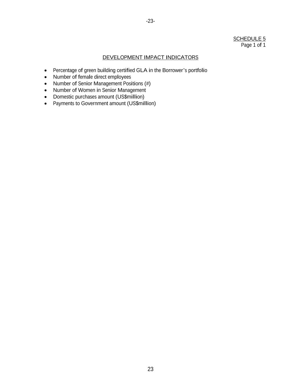 -23- 23 SCHEDULE 5 Page 1 of 1 DEVELOPMENT IMPACT INDICATORS • Percentage of green building certified GLA in the Borrower’s portfolio • Number of female direct employees • Number of Senior Management Positions (#) • Number of Women in Senior Management • Domestic purchases amount (US$million) • Payments to Government amount (US$million)
