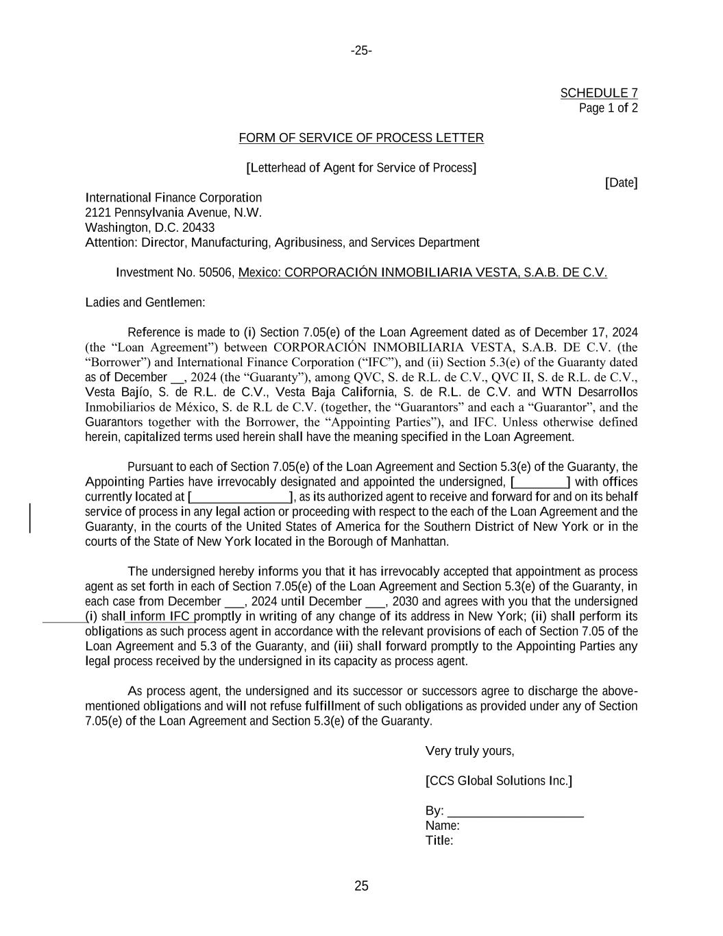 -25- 25 SCHEDULE 7 Page 1 of 2 FORM OF SERVICE OF PROCESS LETTER [Letterhead of Agent for Service of Process] [Date] International Finance Corporation 2121 Pennsylvania Avenue, N.W. Washington, D.C. 20433 Attention: Director, Manufacturing, Agribusiness, and Services Department Investment No. 50506, Mexico: CORPORACIÓN INMOBILIARIA VESTA, S.A.B. DE C.V. Ladies and Gentlemen: Reference is made to (i) Section 7.05(e) of the Loan Agreement dated as of December 17, 2024 (the “Loan Agreement”) between CORPORACIÓN INMOBILIARIA VESTA, S.A.B. DE C.V. (the “Borrower”) and International Finance Corporation (“IFC”), and (ii) Section 5.3(e) of the Guaranty dated as of December __, 2024 (the “Guaranty”), among QVC, S. de R.L. de C.V., QVC II, S. de R.L. de C.V., Vesta Bajío, S. de R.L. de C.V., Vesta Baja California, S. de R.L. de C.V. and WTN Desarrollos Inmobiliarios de México, S. de R.L de C.V. (together, the “Guarantors” and each a “Guarantor”, and the Guarantors together with the Borrower, the “Appointing Parties”), and IFC. Unless otherwise defined herein, capitalized terms used herein shall have the meaning specified in the Loan Agreement. Pursuant to each of Section 7.05(e) of the Loan Agreement and Section 5.3(e) of the Guaranty, the Appointing Parties have irrevocably designated and appointed the undersigned, [________] with offices currently located at [_______________], as its authorized agent to receive and forward for and on its behalf service of process in any legal action or proceeding with respect to the each of the Loan Agreement and the Guaranty, in the courts of the United States of America for the Southern District of New York or in the courts of the State of New York located in the Borough of Manhattan. The undersigned hereby informs you that it has irrevocably accepted that appointment as process agent as set forth in each of Section 7.05(e) of the Loan Agreement and Section 5.3(e) of the Guaranty, in each case from December ___, 2024 until December ___, 2030 and agrees with you that the undersigned (i) shall inform IFC promptly in writing of any change of its address in New York; (ii) shall perform its obligations as such process agent in accordance with the relevant provisions of each of Section 7.05 of the Loan Agreement and 5.3 of the Guaranty, and (iii) shall forward promptly to the Appointing Parties any legal process received by the undersigned in its capacity as process agent. As process agent, the undersigned and its successor or successors agree to discharge the above- mentioned obligations and will not refuse fulfillment of such obligations as provided under any of Section 7.05(e) of the Loan Agreement and Section 5.3(e) of the Guaranty. Very truly yours, [CCS Global Solutions Inc.] By: _____________________ Name: Title: