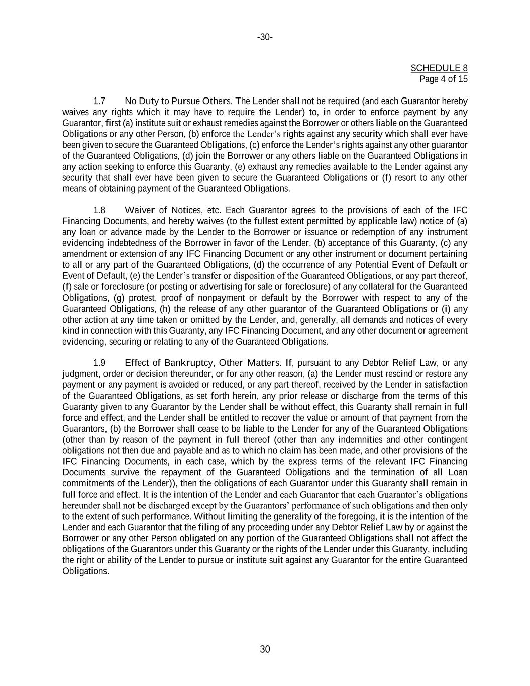 -30- 30 SCHEDULE 8 Page 4 of 15 1.7 No Duty to Pursue Others. The Lender shall not be required (and each Guarantor hereby waives any rights which it may have to require the Lender) to, in order to enforce payment by any Guarantor, first (a) institute suit or exhaust remedies against the Borrower or others liable on the Guaranteed Obligations or any other Person, (b) enforce the Lender’s rights against any security which shall ever have been given to secure the Guaranteed Obligations, (c) enforce the Lender’s rights against any other guarantor of the Guaranteed Obligations, (d) join the Borrower or any others liable on the Guaranteed Obligations in any action seeking to enforce this Guaranty, (e) exhaust any remedies available to the Lender against any security that shall ever have been given to secure the Guaranteed Obligations or (f) resort to any other means of obtaining payment of the Guaranteed Obligations. 1.8 Waiver of Notices, etc. Each Guarantor agrees to the provisions of each of the IFC Financing Documents, and hereby waives (to the fullest extent permitted by applicable law) notice of (a) any loan or advance made by the Lender to the Borrower or issuance or redemption of any instrument evidencing indebtedness of the Borrower in favor of the Lender, (b) acceptance of this Guaranty, (c) any amendment or extension of any IFC Financing Document or any other instrument or document pertaining to all or any part of the Guaranteed Obligations, (d) the occurrence of any Potential Event of Default or Event of Default, (e) the Lender’s transfer or disposition of the Guaranteed Obligations, or any part thereof, (f) sale or foreclosure (or posting or advertising for sale or foreclosure) of any collateral for the Guaranteed Obligations, (g) protest, proof of nonpayment or default by the Borrower with respect to any of the Guaranteed Obligations, (h) the release of any other guarantor of the Guaranteed Obligations or (i) any other action at any time taken or omitted by the Lender, and, generally, all demands and notices of every kind in connection with this Guaranty, any IFC Financing Document, and any other document or agreement evidencing, securing or relating to any of the Guaranteed Obligations. 1.9 Effect of Bankruptcy, Other Matters. If, pursuant to any Debtor Relief Law, or any judgment, order or decision thereunder, or for any other reason, (a) the Lender must rescind or restore any payment or any payment is avoided or reduced, or any part thereof, received by the Lender in satisfaction of the Guaranteed Obligations, as set forth herein, any prior release or discharge from the terms of this Guaranty given to any Guarantor by the Lender shall be without effect, this Guaranty shall remain in full force and effect, and the Lender shall be entitled to recover the value or amount of that payment from the Guarantors, (b) the Borrower shall cease to be liable to the Lender for any of the Guaranteed Obligations (other than by reason of the payment in full thereof (other than any indemnities and other contingent obligations not then due and payable and as to which no claim has been made, and other provisions of the IFC Financing Documents, in each case, which by the express terms of the relevant IFC Financing Documents survive the repayment of the Guaranteed Obligations and the termination of all Loan commitments of the Lender)), then the obligations of each Guarantor under this Guaranty shall remain in full force and effect. It is the intention of the Lender and each Guarantor that each Guarantor’s obligations hereunder shall not be discharged except by the Guarantors’ performance of such obligations and then only to the extent of such performance. Without limiting the generality of the foregoing, it is the intention of the Lender and each Guarantor that the filing of any proceeding under any Debtor Relief Law by or against the Borrower or any other Person obligated on any portion of the Guaranteed Obligations shall not affect the obligations of the Guarantors under this Guaranty or the rights of the Lender under this Guaranty, including the right or ability of the Lender to pursue or institute suit against any Guarantor for the entire Guaranteed Obligations.