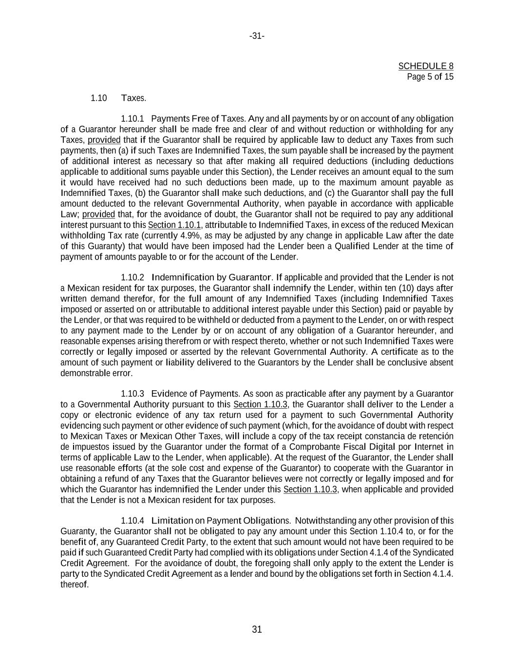 -31- 31 SCHEDULE 8 Page 5 of 15 1.10 Taxes. 1.10.1 Payments Free of Taxes. Any and all payments by or on account of any obligation of a Guarantor hereunder shall be made free and clear of and without reduction or withholding for any Taxes, provided that if the Guarantor shall be required by applicable law to deduct any Taxes from such payments, then (a) if such Taxes are Indemnified Taxes, the sum payable shall be increased by the payment of additional interest as necessary so that after making all required deductions (including deductions applicable to additional sums payable under this Section), the Lender receives an amount equal to the sum it would have received had no such deductions been made, up to the maximum amount payable as Indemnified Taxes, (b) the Guarantor shall make such deductions, and (c) the Guarantor shall pay the full amount deducted to the relevant Governmental Authority, when payable in accordance with applicable Law; provided that, for the avoidance of doubt, the Guarantor shall not be required to pay any additional interest pursuant to this Section 1.10.1, attributable to Indemnified Taxes, in excess of the reduced Mexican withholding Tax rate (currently 4.9%, as may be adjusted by any change in applicable Law after the date of this Guaranty) that would have been imposed had the Lender been a Qualified Lender at the time of payment of amounts payable to or for the account of the Lender. 1.10.2 Indemnification by Guarantor. If applicable and provided that the Lender is not a Mexican resident for tax purposes, the Guarantor shall indemnify the Lender, within ten (10) days after written demand therefor, for the full amount of any Indemnified Taxes (including Indemnified Taxes imposed or asserted on or attributable to additional interest payable under this Section) paid or payable by the Lender, or that was required to be withheld or deducted from a payment to the Lender, on or with respect to any payment made to the Lender by or on account of any obligation of a Guarantor hereunder, and reasonable expenses arising therefrom or with respect thereto, whether or not such Indemnified Taxes were correctly or legally imposed or asserted by the relevant Governmental Authority. A certificate as to the amount of such payment or liability delivered to the Guarantors by the Lender shall be conclusive absent demonstrable error. 1.10.3 Evidence of Payments. As soon as practicable after any payment by a Guarantor to a Governmental Authority pursuant to this Section 1.10.3, the Guarantor shall deliver to the Lender a copy or electronic evidence of any tax return used for a payment to such Governmental Authority evidencing such payment or other evidence of such payment (which, for the avoidance of doubt with respect to Mexican Taxes or Mexican Other Taxes, will include a copy of the tax receipt constancia de retención de impuestos issued by the Guarantor under the format of a Comprobante Fiscal Digital por Internet in terms of applicable Law to the Lender, when applicable). At the request of the Guarantor, the Lender shall use reasonable efforts (at the sole cost and expense of the Guarantor) to cooperate with the Guarantor in obtaining a refund of any Taxes that the Guarantor believes were not correctly or legally imposed and for which the Guarantor has indemnified the Lender under this Section 1.10.3, when applicable and provided that the Lender is not a Mexican resident for tax purposes. 1.10.4 Limitation on Payment Obligations. Notwithstanding any other provision of this Guaranty, the Guarantor shall not be obligated to pay any amount under this Section 1.10.4 to, or for the benefit of, any Guaranteed Credit Party, to the extent that such amount would not have been required to be paid if such Guaranteed Credit Party had complied with its obligations under Section 4.1.4 of the Syndicated Credit Agreement. For the avoidance of doubt, the foregoing shall only apply to the extent the Lender is party to the Syndicated Credit Agreement as a lender and bound by the obligations set forth in Section 4.1.4. thereof.